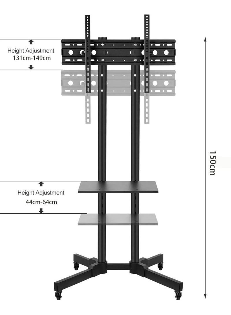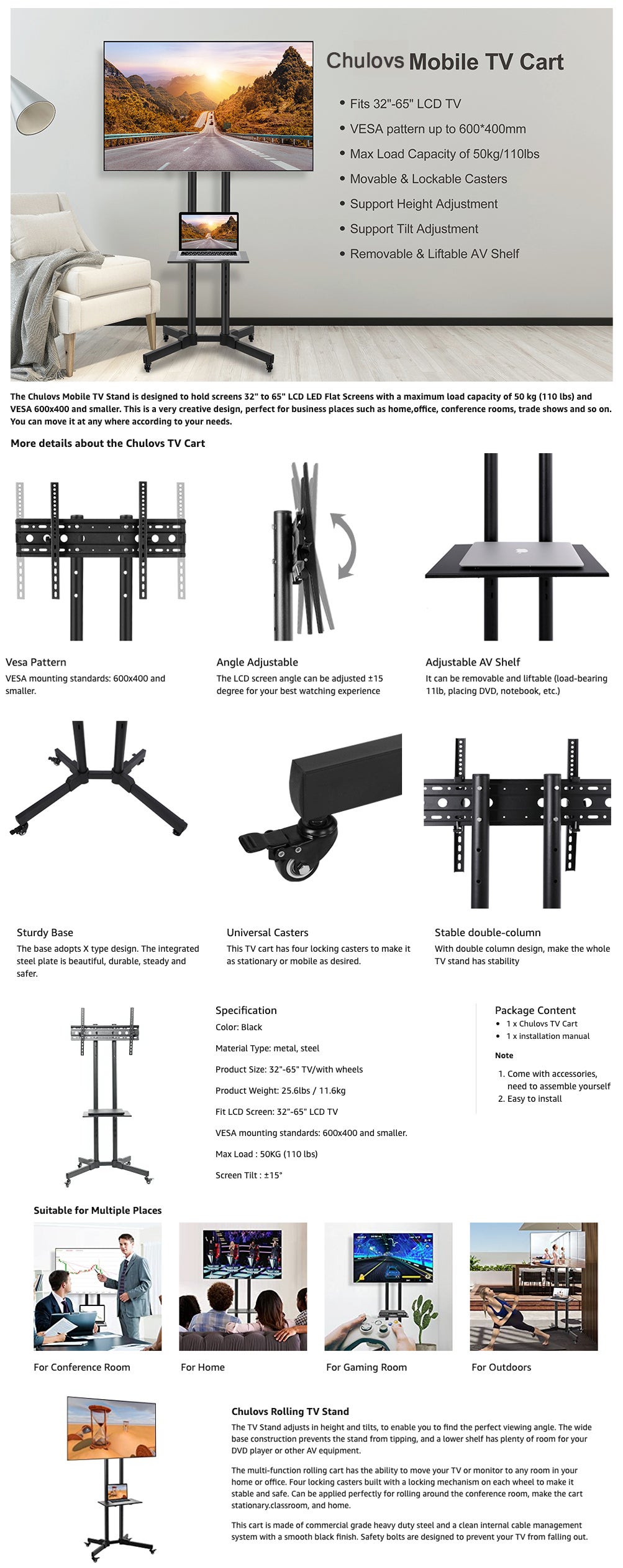 Mobile TV Stand is designed to hold screens 32"" to 75"" LCD LED Flat Screens with a maximum load capacity of 50 kg (110 lbs) and VESA 600x400 and smaller. This is a very creative design, perfect for business places such as home,office, conference rooms, trade shows and so on. You can move it at any where according to your needs. Specification Color: Black Material Type: metal, steel Product Size: 32""-75"" TV/with wheels Product Weight: 25.6lbs / 11.6kg Fit LCD Screen: 32""-75"" LCD TV VESA mounting standards: 600x400 and smaller. Max Load : 50KG (110 lbs) Screen Tilt : ±15°