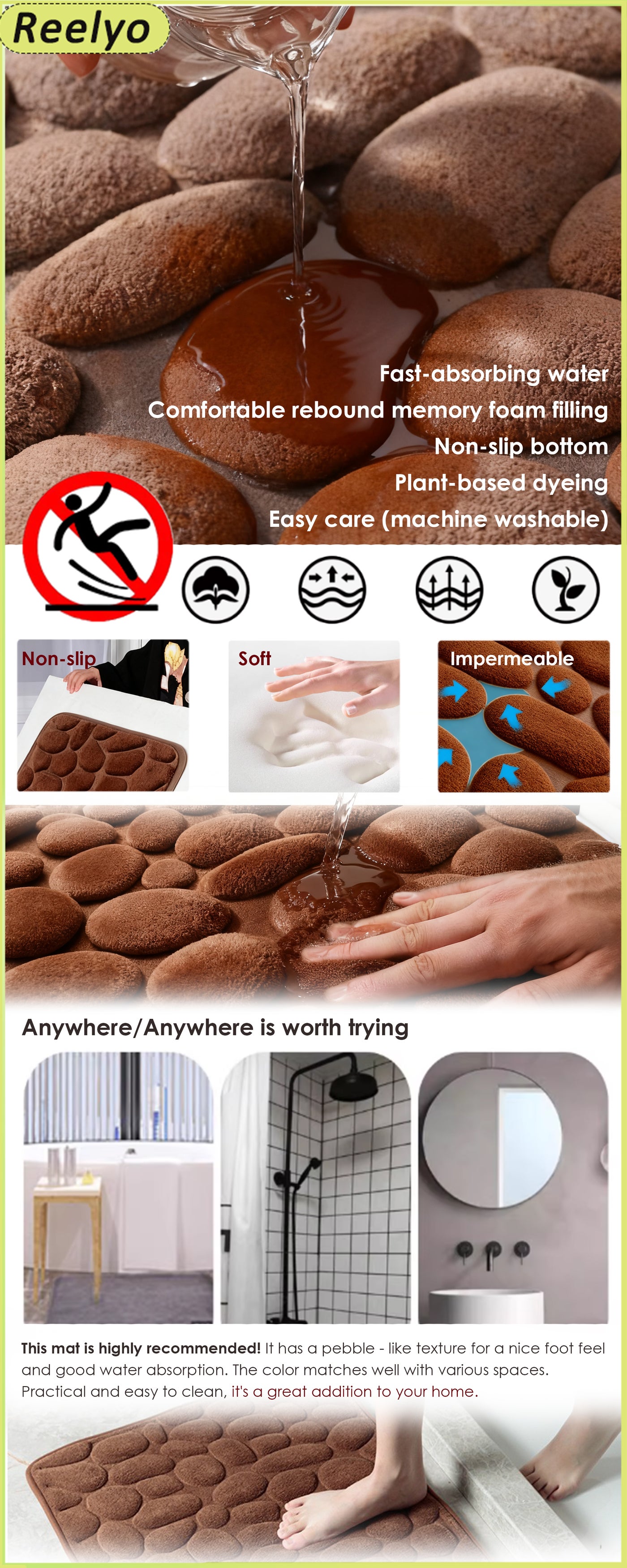 - Beyond bathrooms, it works as a kitchen mat (absorbing spills), entryway mat (catching dirt), or bedroom rug (adding coziness). Its modern pebble design complements any home decor style.