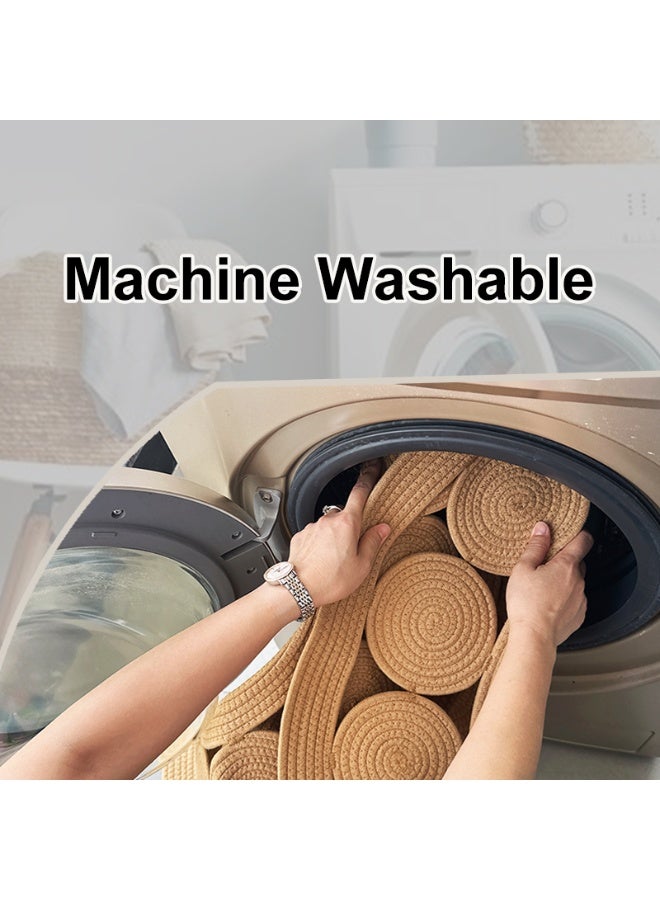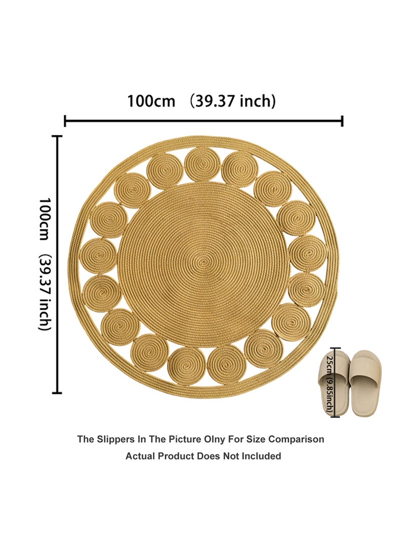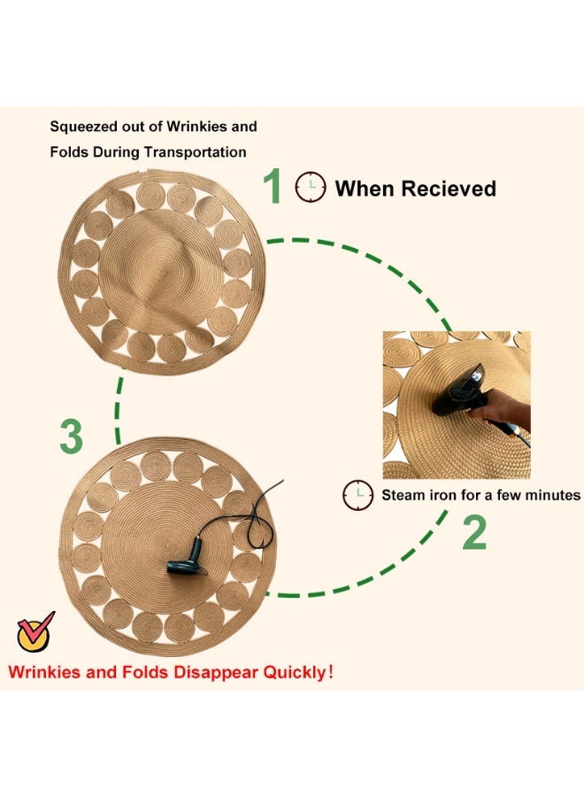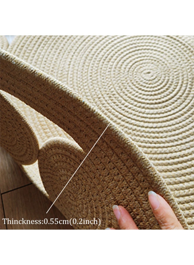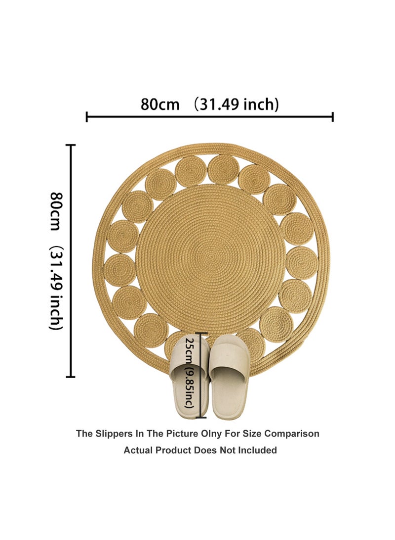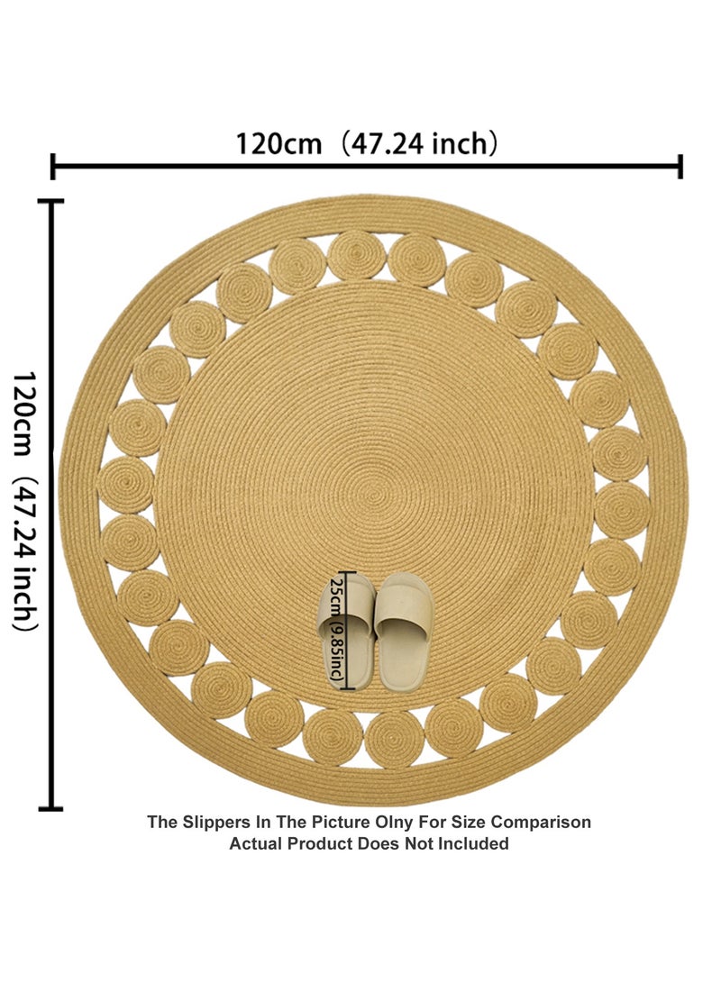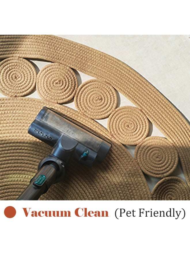 Handwoven from natural linen and cotton, this bohemian round rug brings texture and warmth to your home. Its textured surface grips the floor naturally – no slipping. Machine washable and foldable for easy storage. Natural color with artistic boho details.