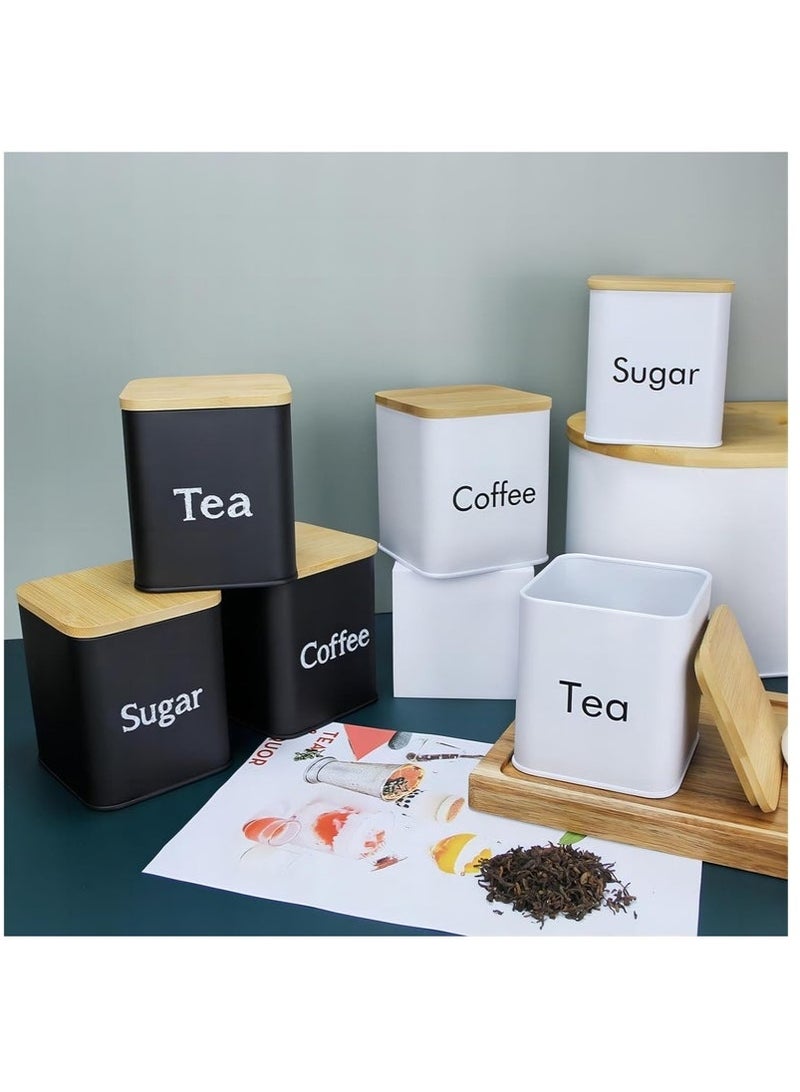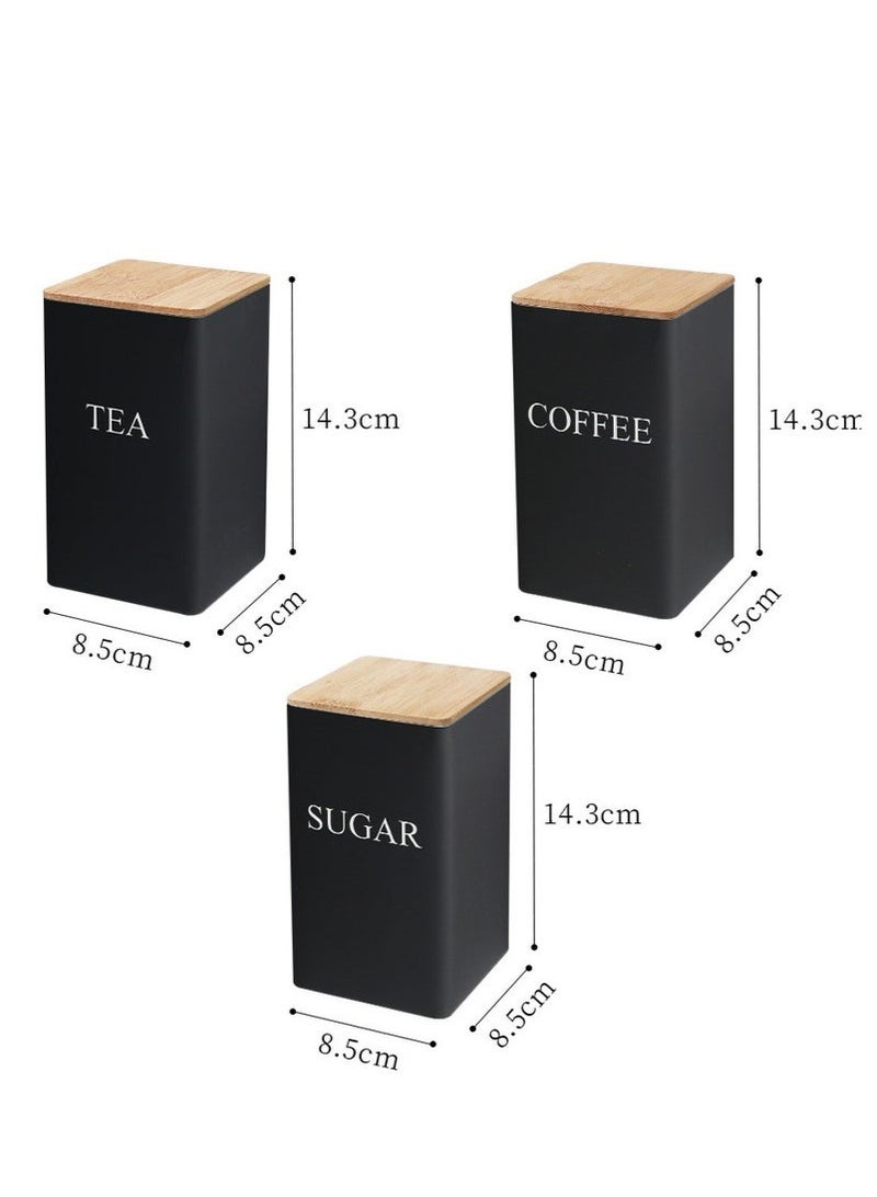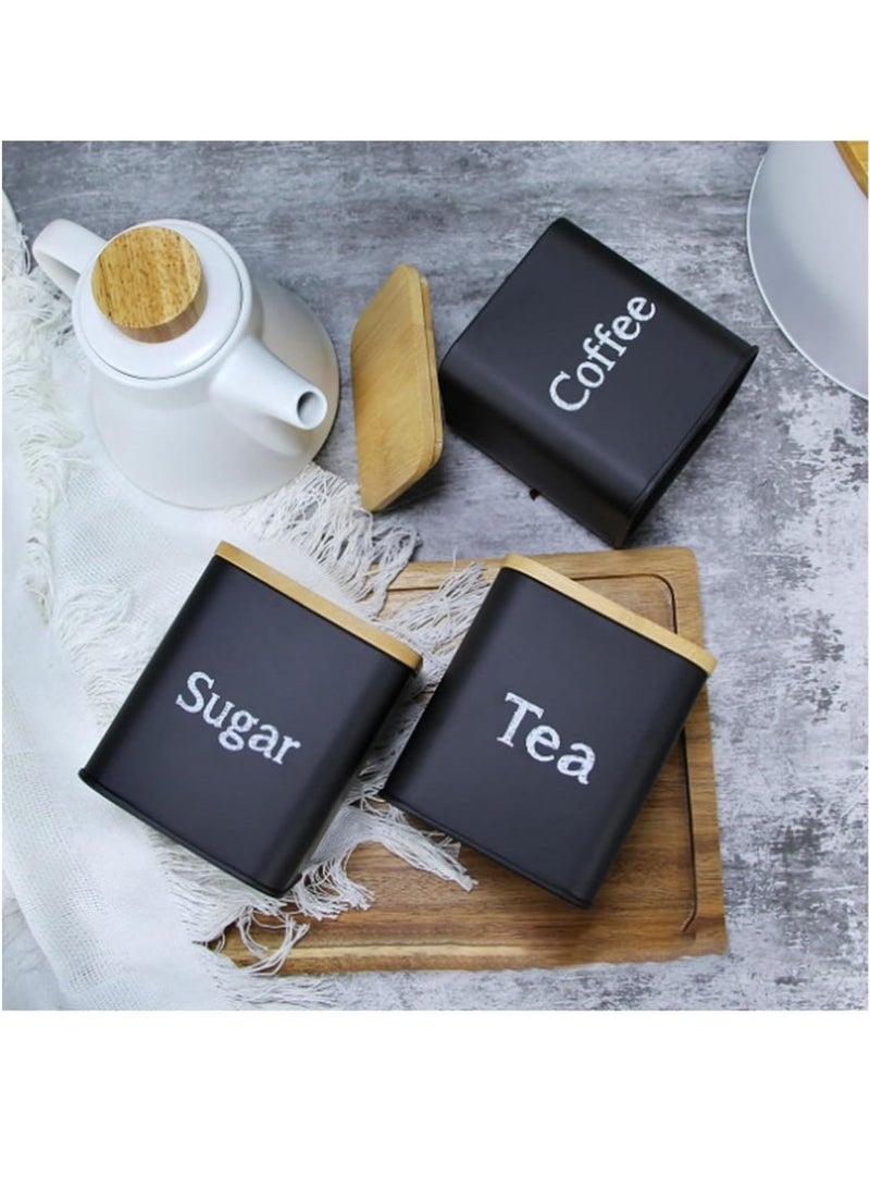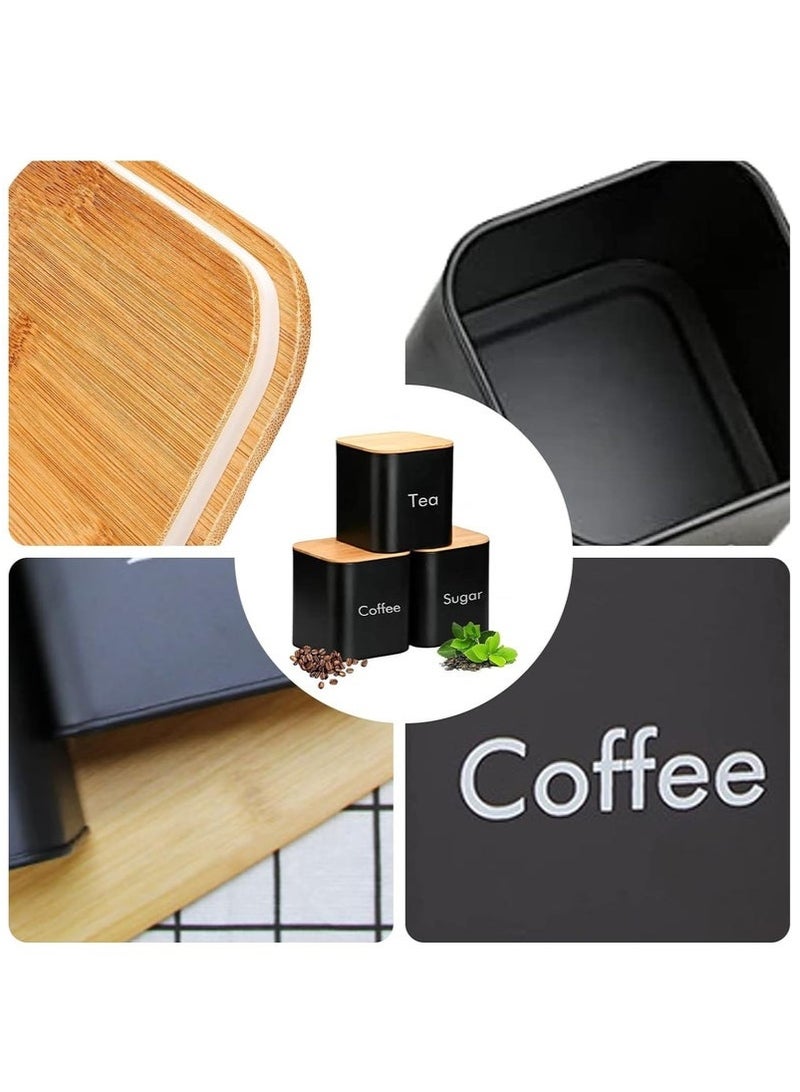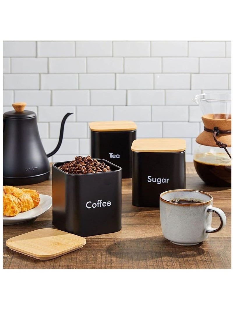 Coffee Tea Sugar Container Set - Black Iron Kitchen Canister Set with Bamboo Lids (3 Pieces, 48 oz)