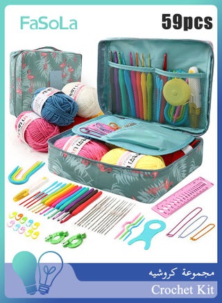 [Crochet Beginner's Kit] This Crochet kit includes 59 different knitting tools, 10 small pins, 3 aluminum pins, 12 lace crochets, 3 fried dough twist needles, 6 sewing needles, 2 ball makers, 1 safety scissors, 4 curved needles, 1 fish shaped winding board, 1 tape measure, 1 ruler, 5 wool, 9 color crochets, and 1 receiving bag. The whole Crochet kit meets your basic manual knitting needs.