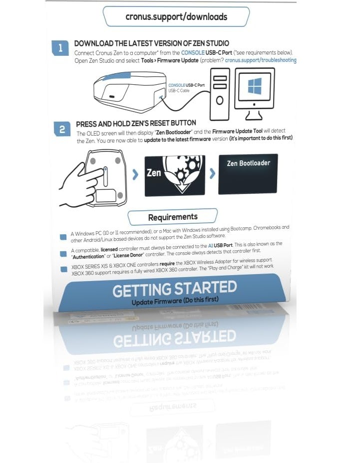 | What's In The Box | 1 × Cronus Zen adapter 1 × Micro-USB cable (for programming/firmware updates) 1 × Mini-USB cable (for console connection) 1 × USB extension cable (for controller connection) Quick start guide / user documentation |