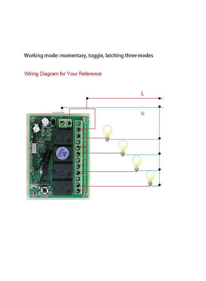 *Learning pair code: it can work with any remote control with the same frequency, so you needn't worry about losing remote control any more. (If the remote control is lost, buy one and pair with the PCB board is OK.)