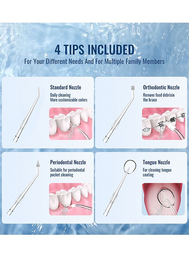 We offer four types of nozzles including standard nozzles, orthodontic nozzles, periodontal pocket nozzles and tongue scraper nozzles. It can help you clean your teeth, clean your braces, clean periodontal pockets, and clean your tongue.
