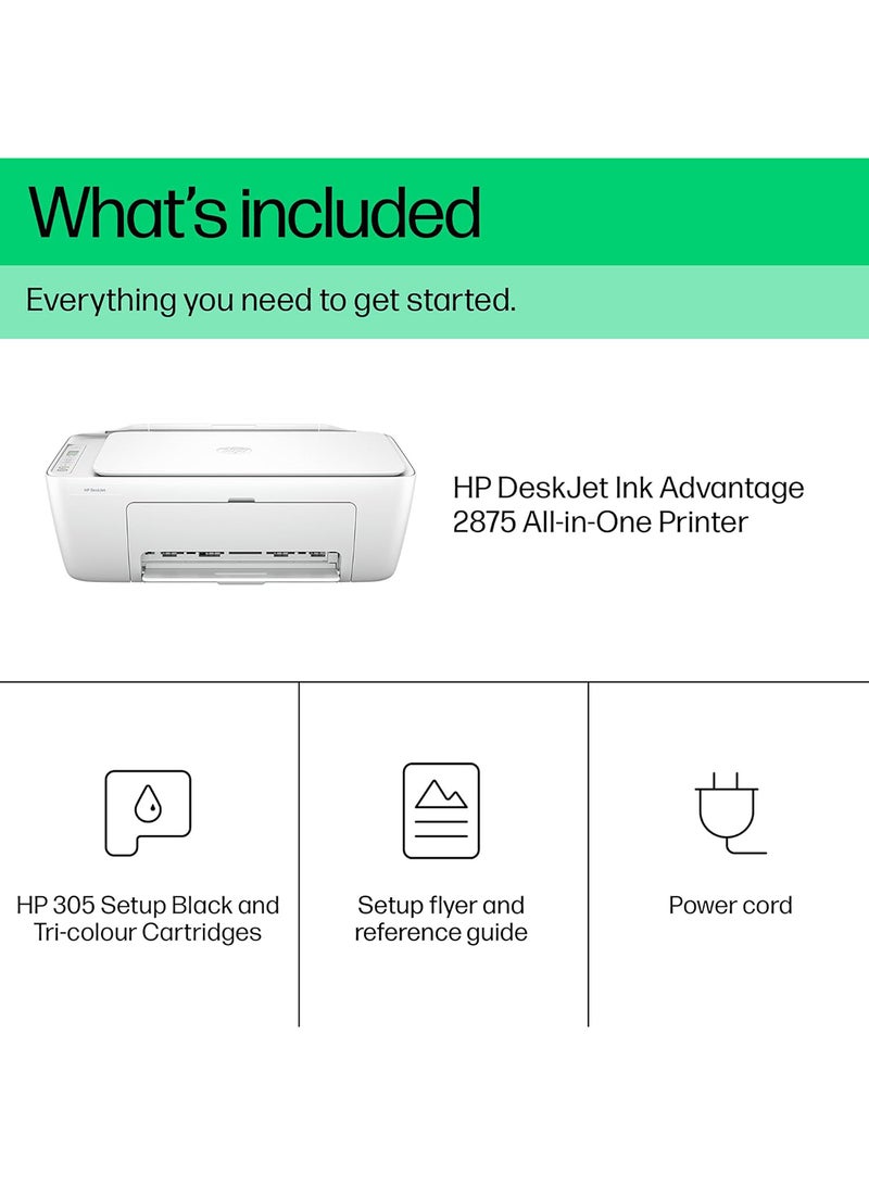 | What's In The Box | HP DeskJet Ink Advantage 2875 All-in-One; HP 682 Setup Black Cartridge; HP 682 Setup Tri-color Cartridge; Regulatory flyer; Setup guide; Reference guide; Power cord, USB cable |