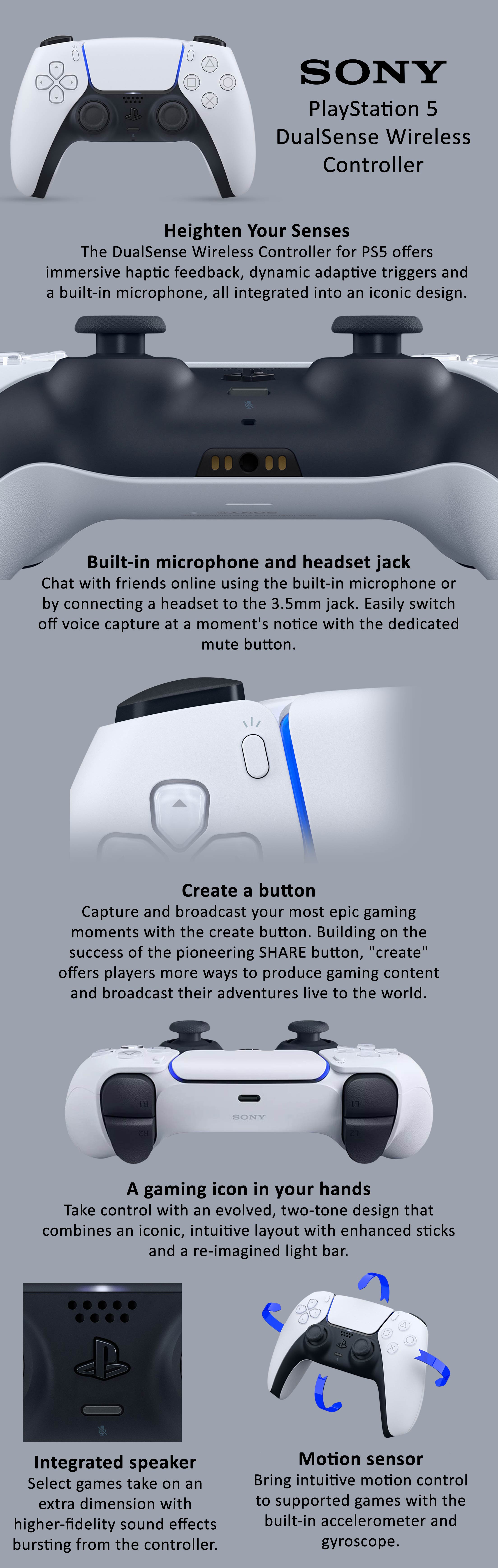 The DualSense wireless controller for PS5 offers immersive haptic feedback, dynamic adaptive triggers and a built-in microphone, all integrated into an iconic design.