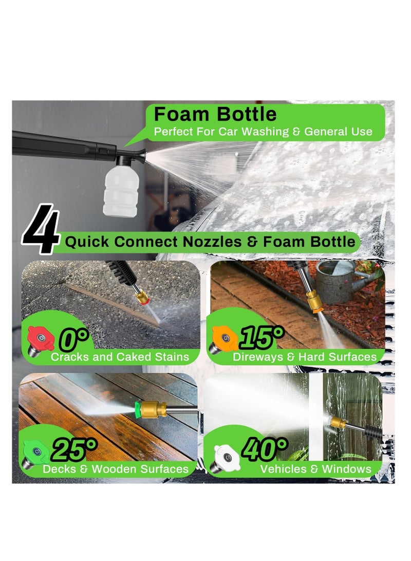 [4 Universal Nozzles] The 0° tip delivers super high pressure for dissolving stubborn substances on hard surface. 15° tip delivers is great for concrete and bric with hard surface. 25° tip delivers medium pressure for wood decks, vinyl fence with soft surface. 40° tip provides low pressure for windows and screens with fragile surfaces. It is easy to assemble. About 2/3 of them have been installed when the package arrive. You only need to connect the spray gun, outlet hose and inlet hose. Of course, choose the nozzle or foam bottle you need. In addition, the 4 wheels and compact size makes it easy to remove and store in garage, living room, or kitchen.