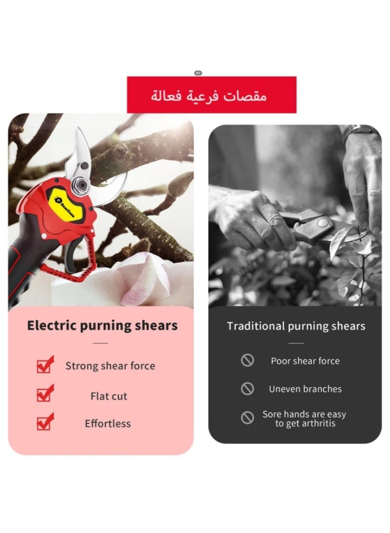 Specifications: Material: Plastic and stainless steel Color: red and black Voltage: 220V(EU) Cutting capacity: 0-25mm diameter Battery: 21V 1200mAh lithium battery Charging Time: 2.5 hours Constantly Using Time: 2-3 hours Size: 25*7cm Package information: Package weight: 1750g Package size: 32*25*9cm Package list: 1*Electric Pruning Shears 1*Battery 1*Charging Cable 1*Wrench 1*Screwdriver 1*User Manual 1*Storage Box