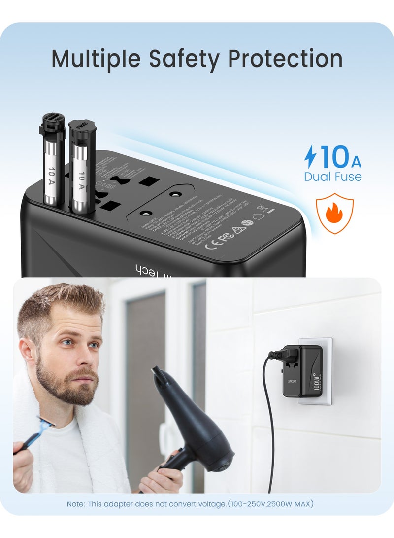 【Cutting-edge GaN III Technology】GaN Pro tech makes our latest travel adapter smaller without a drop of power, and provides better low-temperature fast charging experience. Equipped with integrated double 10A fuse for overload protection and safety valve, it will protect people from injury if they directly touch live parts on the socket.