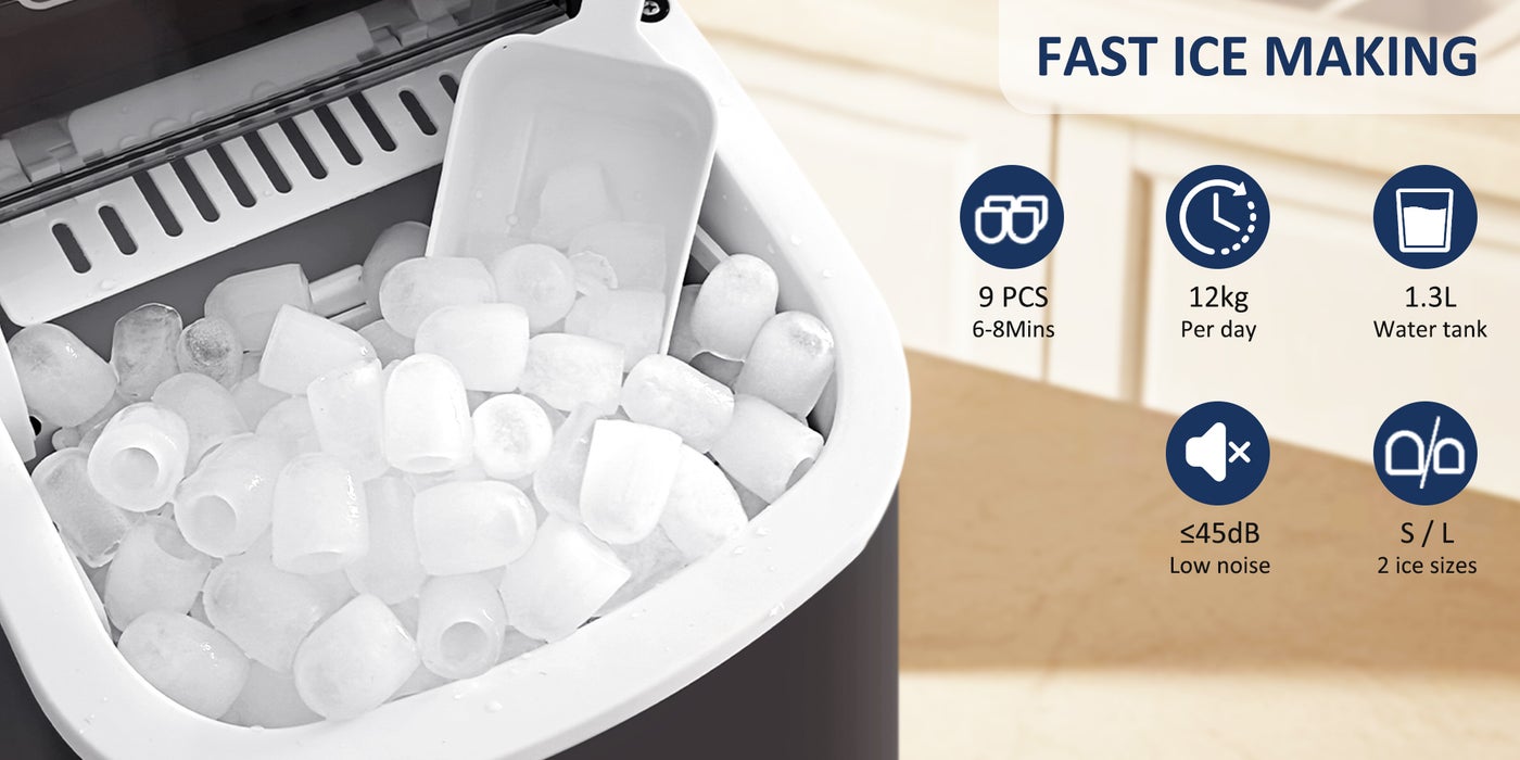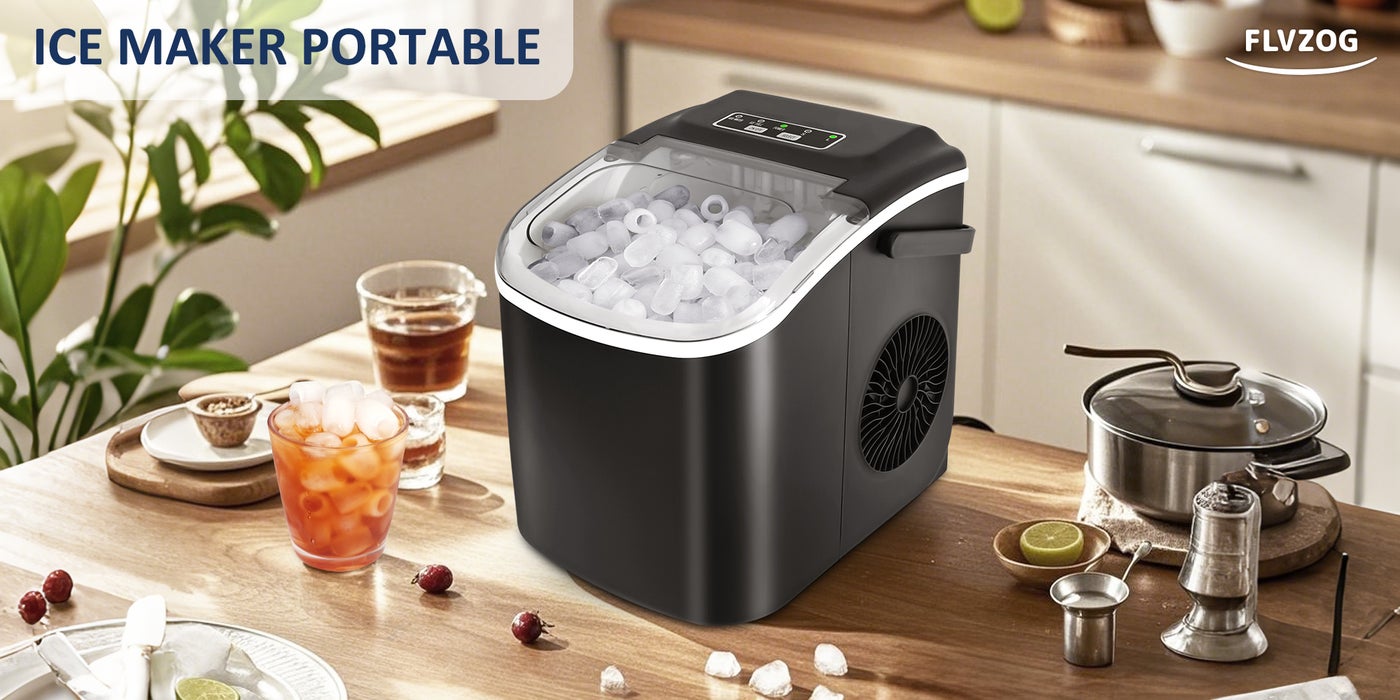 【Rapid Ice Production】: Experience the convenience of quick ice-making with Flvzog ice maker, which takes just 6-8 minutes each round to form 9 shaped bullet-shaped ice cubes, producing 12kg of ice a day.