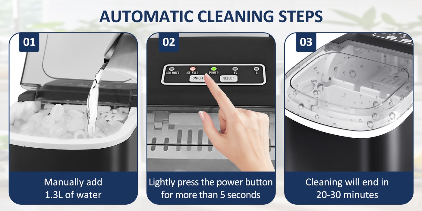 【Self-Cleaning Functionality】: Countertop ice maker features a one-touch self-cleaning function – simply press the "Clean" button, and in just 5 seconds, the machine initiates its self-cleaning process, maintaining hygiene effortlessly.