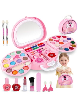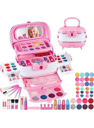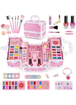 【Luxurious Kids Makeup Kit for Girl】: We have prepared a rich and fun unicorn makeup set, which can satisfy girls' curiosity about makeup. Girls can get 1 cosmetic bag (with a pompom pendant), 2 sets eye shadows ( with a watch style), 1 nail polish set (2 bottles of nail polish, 1 nail file, 1 toe splitter);6 lipstick/gloss (cartoon pattern and heart shape, etc.), 2 blush, 5 brush;3 hair clip (include unicorn style), 1 set of princess accessories (crown, necklace , ring, earring, gem sticker).