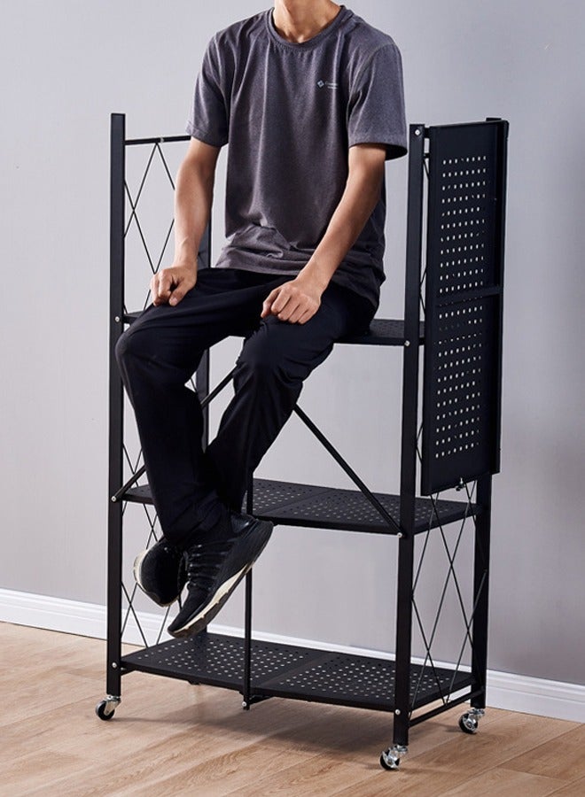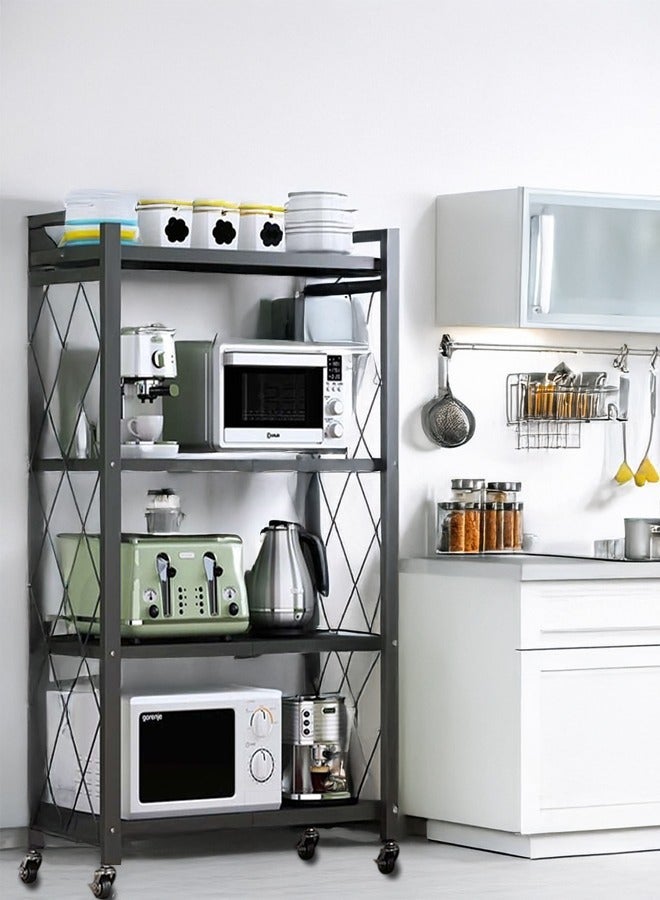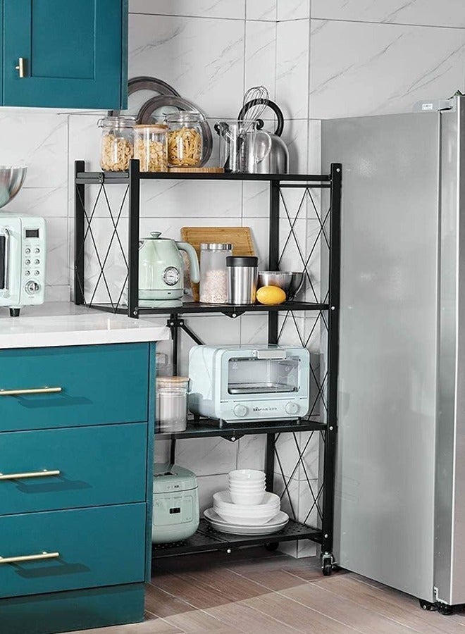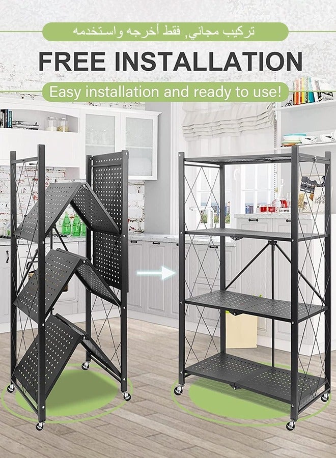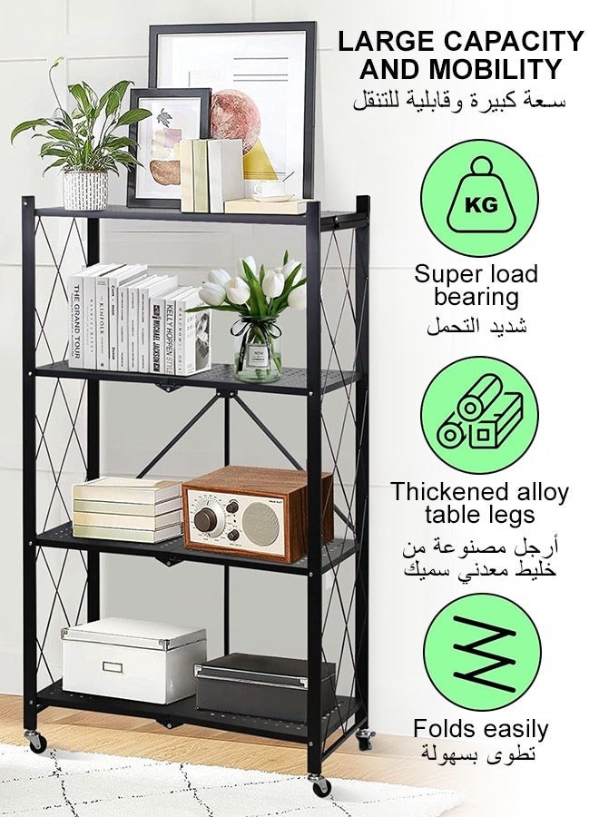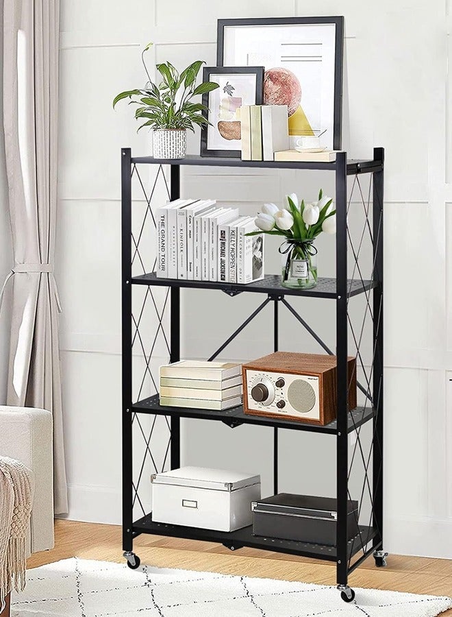 Kitchen Storage Rack and Heavy Duty Metal Shelving Unit on Rolling Cart for Garage, Kitchen, Basement, Pantry, 4-Tier Thick Foldable Storage Shelves with Wheels, Large Capacity, Black