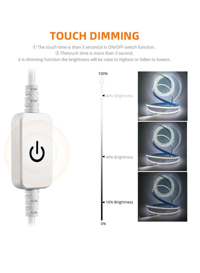 The LED strip dimmer switch is a Touch-operated control. Just Touch the Button to adjust the brightness or simply turn the light on/off.