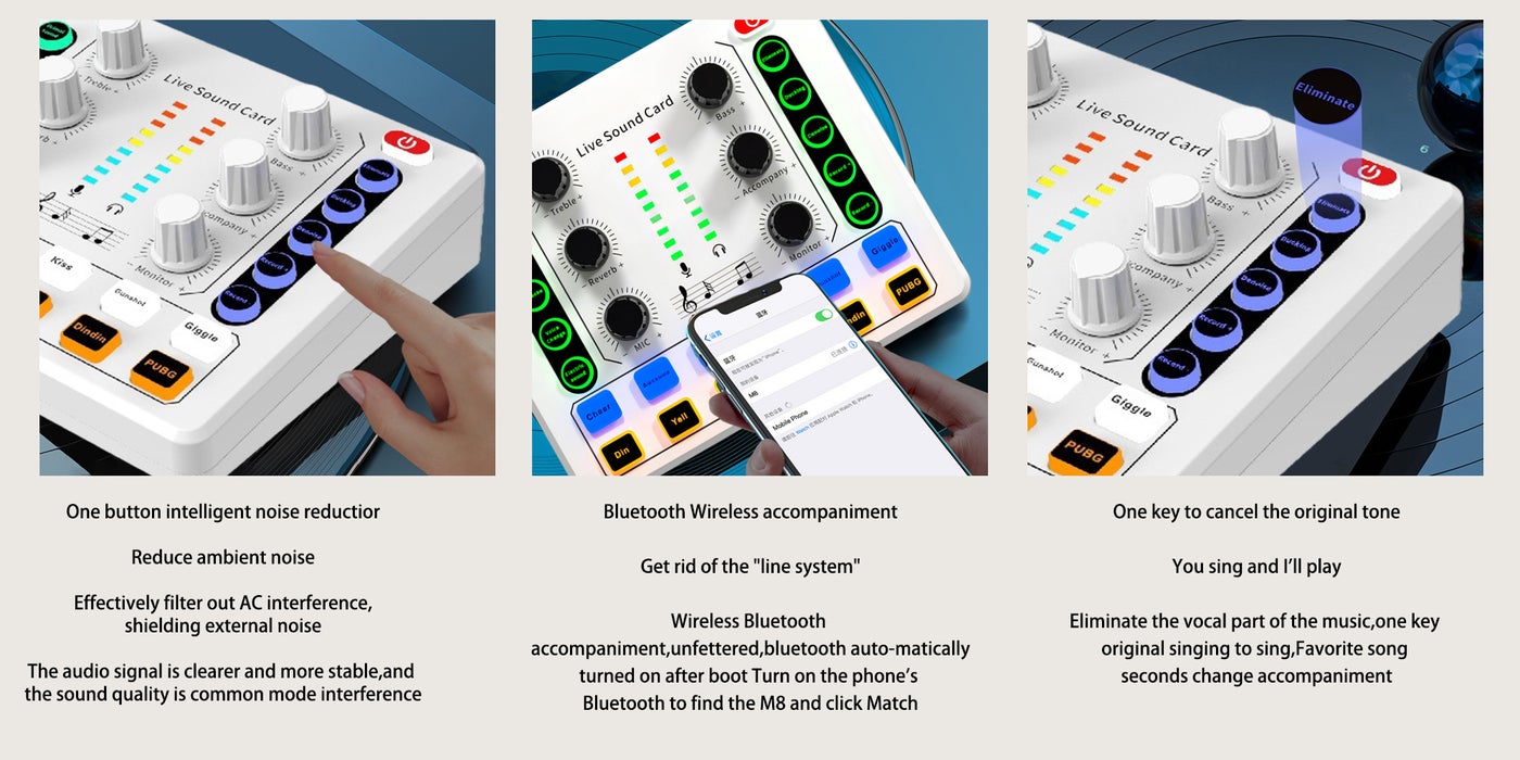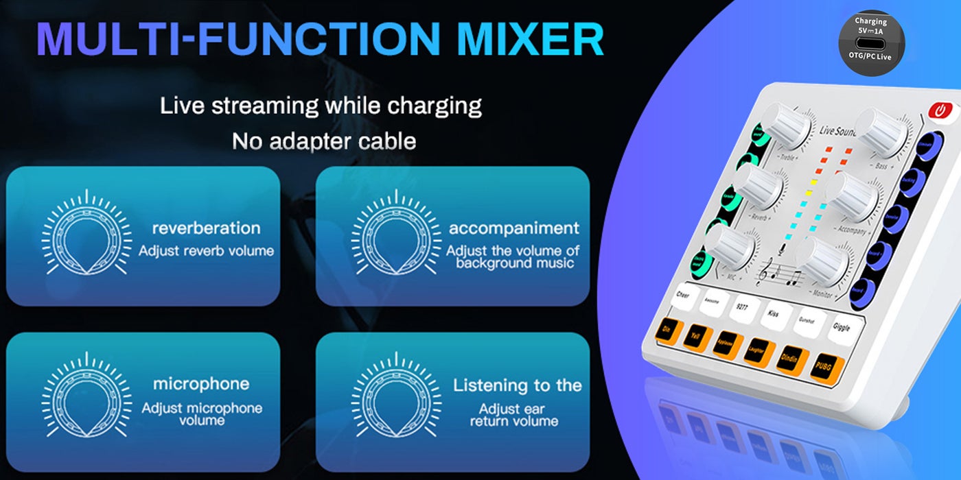Experience the brilliance of smart dodge technology, intelligently reducing background sound when you speak. Activate dodge mode to automatically adjust the accompaniment music volume, ensuring a seamless and professional live broadcast. Say goodbye to awkward moments and elevate your live broadcasts to new heights with our Multifunctional Mixer.