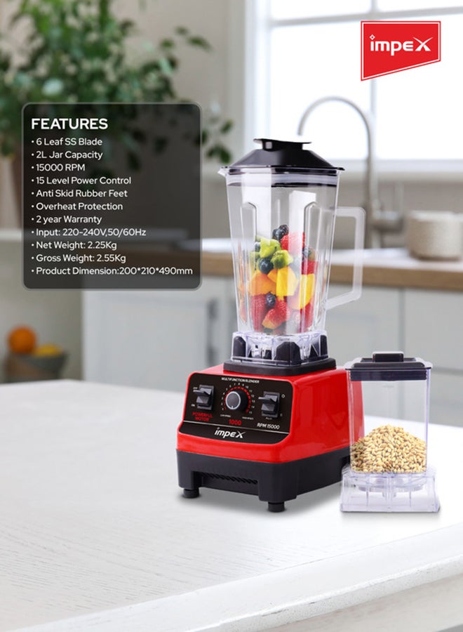 Experience effortless blending, grinding, and mixing with the Impex 2-in-1 Blender (BL 1002), your perfect kitchen companion, designed to save time and enhance cooking convenience. Engineered with a powerful 15000 RPM motor and equipped with 6 high-quality stainless steel blades, this blender ensures smooth, consistent results in seconds. Whether you’re preparing nutritious smoothies, grinding spices, or blending soups, the Impex BL 1002 delivers unmatched performance. The 2-liter jar capacity gives you ample space for family-sized servings, making it ideal for both daily use and entertaining guests. With its sleek, modern design and compact 200x210x490mm dimensions, this blender fits seamlessly into any kitchen space.