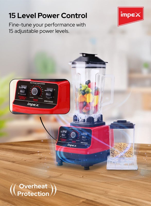 The Impex BL 1002 Blender comes with advanced features to ensure safety, efficiency, and durability. Built with overheat protection technology, the blender guarantees longer motor life and uninterrupted performance, even during heavy-duty use. The 15-level power control offers precise speed settings, giving you full control over textures—from coarse grinding to silky smooth blending. Its anti-skid rubber feet ensure stability during operation, minimizing vibrations for a noise-free experience. Crafted with premium-quality materials and weighing just 2.25kg net, this blender combines strength with portability. With the 2-in-1 functionality, you can switch between blending and grinding effortlessly, making it a versatile appliance that meets all your kitchen needs.