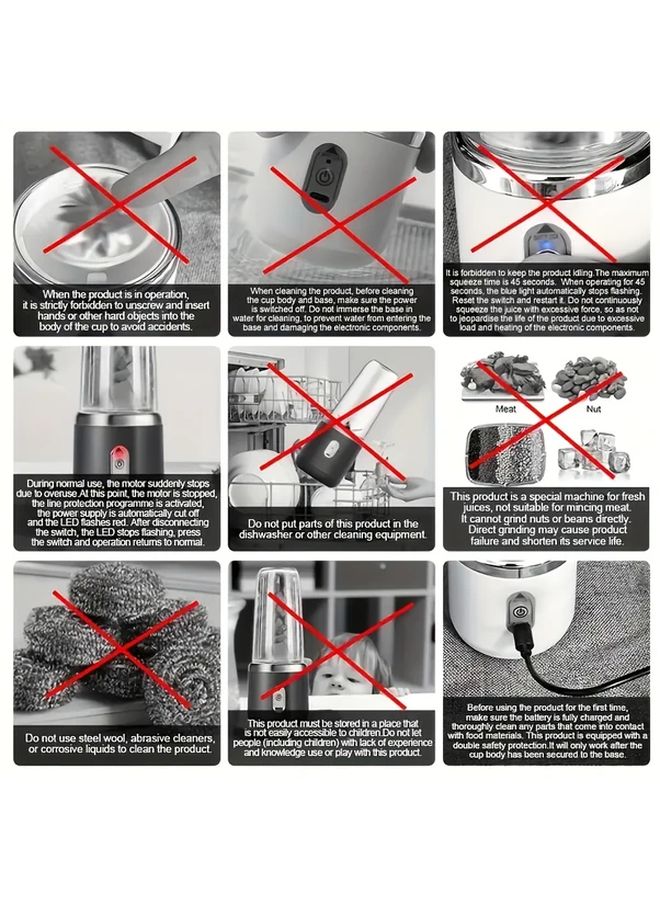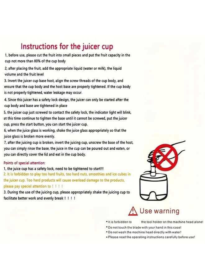 Crafted for portability and durability, its sleek, space-saving design fits perfectly in your bag, making it ideal for the office, gym, or travel. The blending cup, made from high-quality PC material, also serves as your personal drinking bottle for a seamless blend-and-go experience. Cleaning is remarkably easy, saving you time and hassle. Whether you're a fitness enthusiast refueling after a workout or a busy professional needing a quick, healthy meal replacement, this wireless juicer blender is your perfect partner for maintaining a healthy diet amidst a hectic schedule. Enjoy the freedom of on-the-go blending.