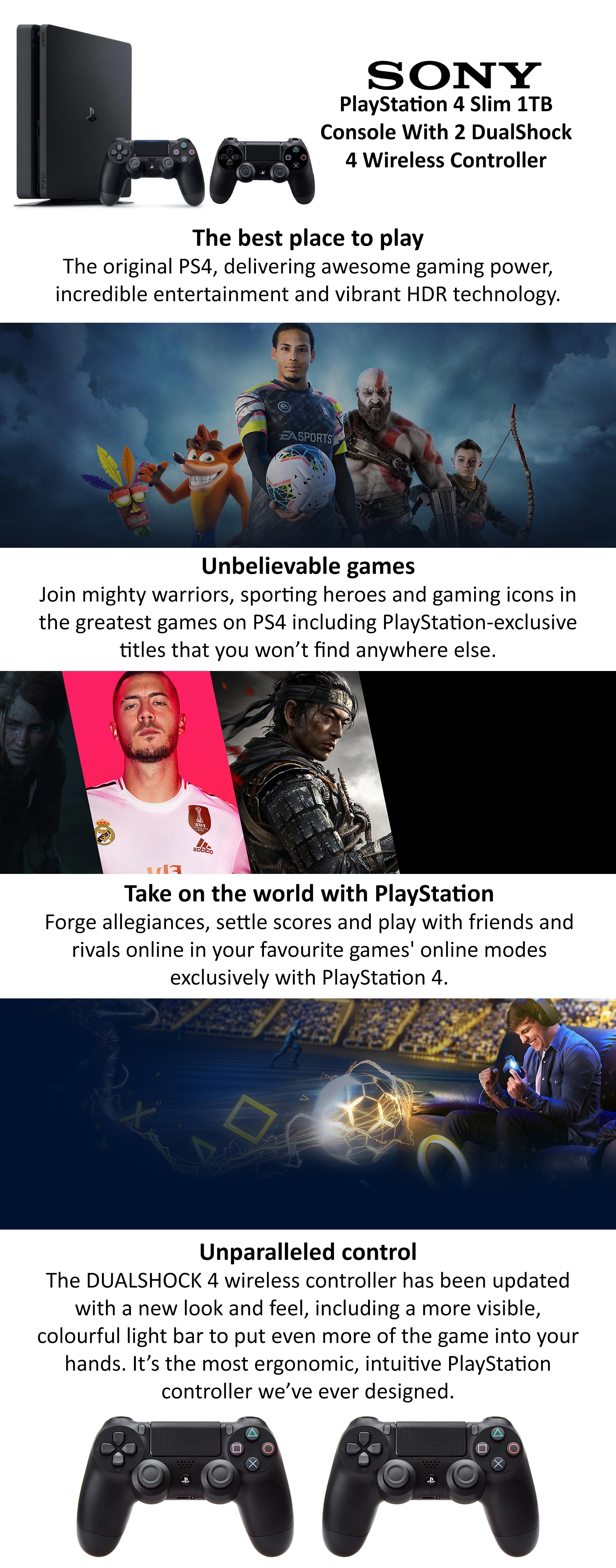 | What's In The Box | 1xPlayStation 4 Slim 1TB Console, 2x DUALSHOCK 4 Wireless Controller |