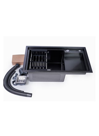 Upgrade your kitchen with the ODONAO Stainless Steel Kitchen Sink in Black Finish with Strainer. Measuring 72x45x22 cm, this single bowl sink provides ample space for washing dishes, fruits, and vegetables while keeping your kitchen organized. Made from high-quality stainless steel, it is resistant to rust, corrosion, and stains, ensuring long-lasting performance. The sleek black finish adds a modern, stylish touch to your kitchen décor. Easy to clean and maintain, this sink perfectly combines functionality, durability, and contemporary design for your home.