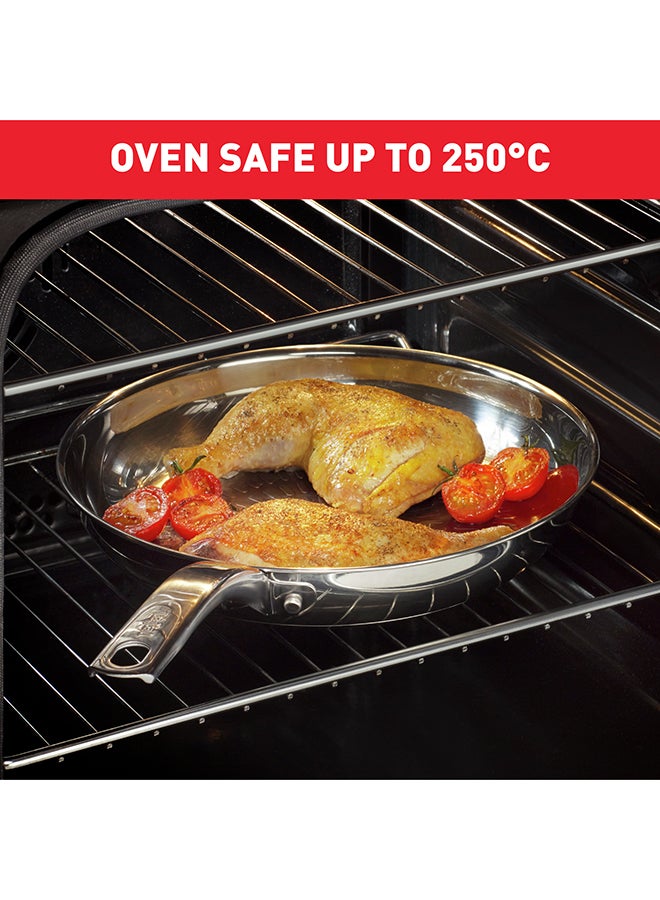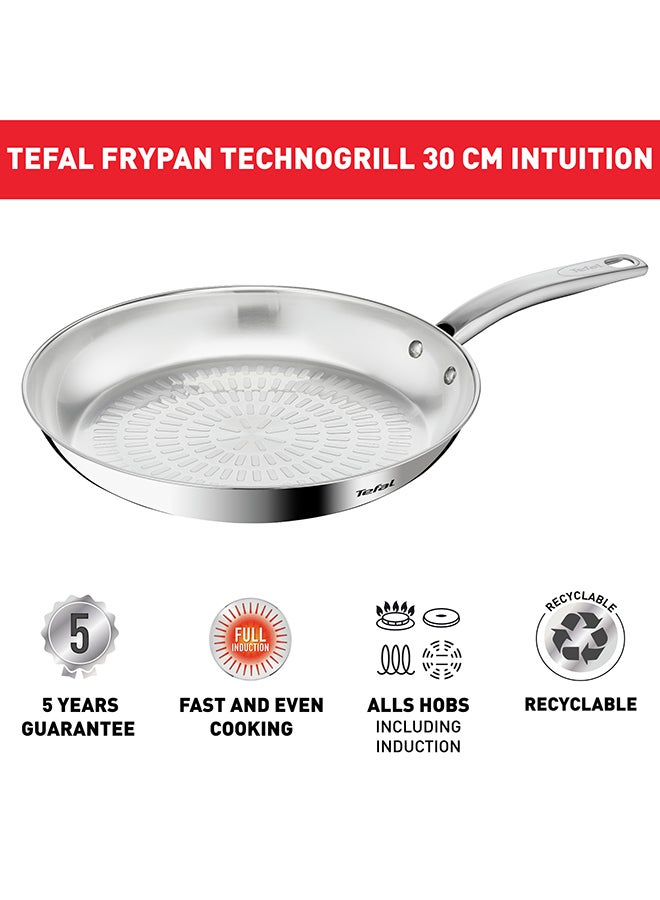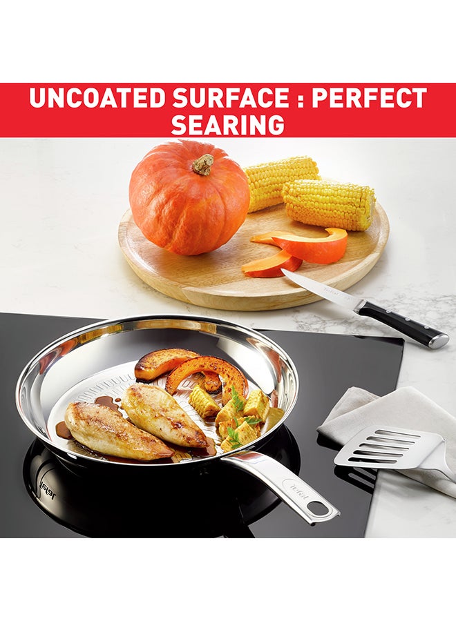 Smart features and performance that's built to last: The Tefal Intuition Frying Pan strikes the perfect balance between durability and modern convenience. With quality backed by a 5-year guarantee, this long-lasting 18/10 stainless steel frypan was designed to meet all your cooking needs day after day. Take your searing game to the next level, with mouth-watering results that come out crispy on the outside and extremely tender on the inside. The uncoated Techno-Grill surface offers the ideal texture for flawless searing and easy release—for everything from choice cuts of meat to shrimp scampi or grilled vegetables—while the thick heat-diffusion base and advanced induction technology ensure even cooking with total ease. The robust yet ergonomic no-gap handle promises a smooth and easy cooking experience with quality that stands the test of time.