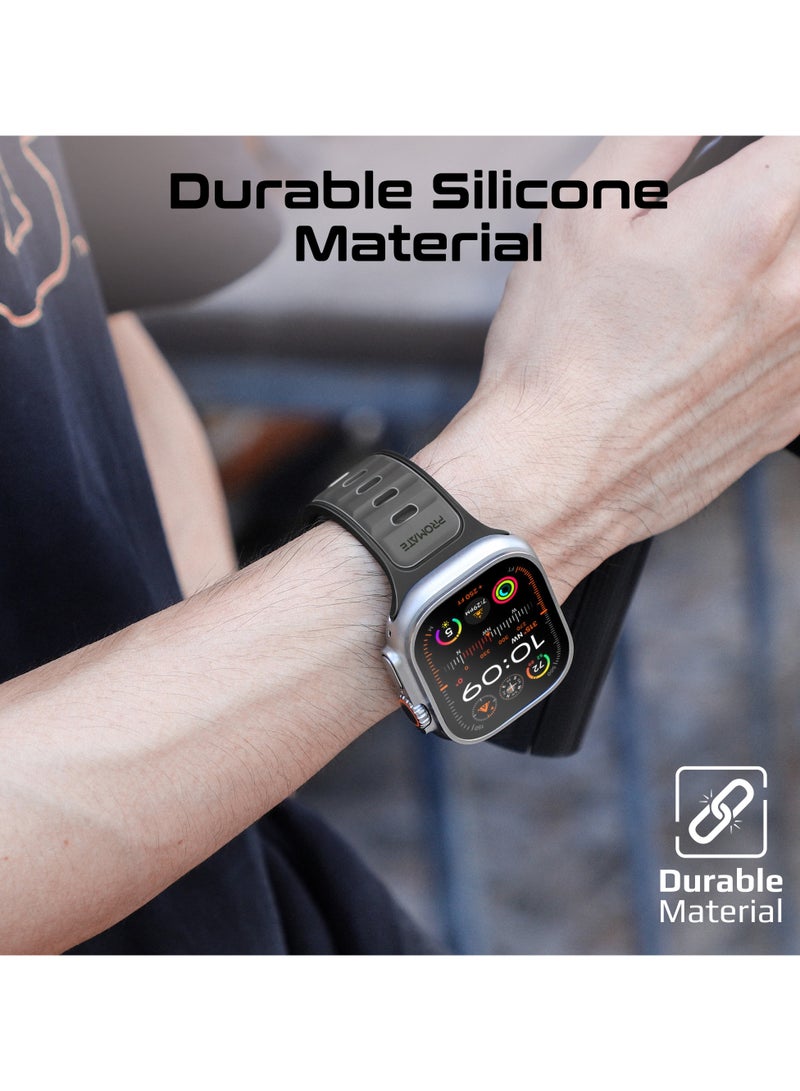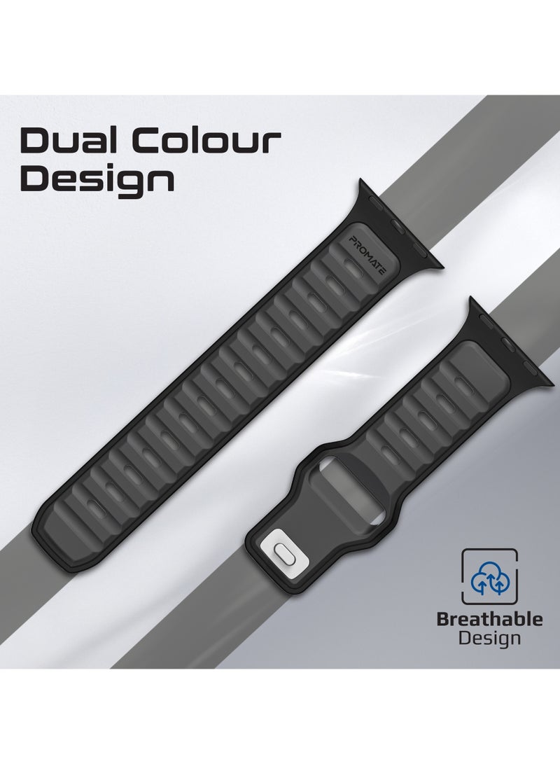 Transform your Apple Watch into a fashion statement with the SiliBand-DC by Promate. This dual-colour band fuses style with a sporty edge, creating the ideal blend for any outfit or occasion. Featuring a dust-proof, UV-treated surface, it maintains its pristine look no matter where your adventures take you. The rust-resistant stainless-steel stud buckle adds a touch of sophistication while ensuring long-term durability. Perfectly compatible with all Apple Watch sizes (42/44/45mm/49mm) and fitting seamlessly with Series 1-9, SE, and Ultra 1-2, the SiliBand-DC is designed for ultimate versatility. Made from high-quality silicone, this band offers unmatched comfort and resilience, making it the essential accessory for any Apple Watch lover.