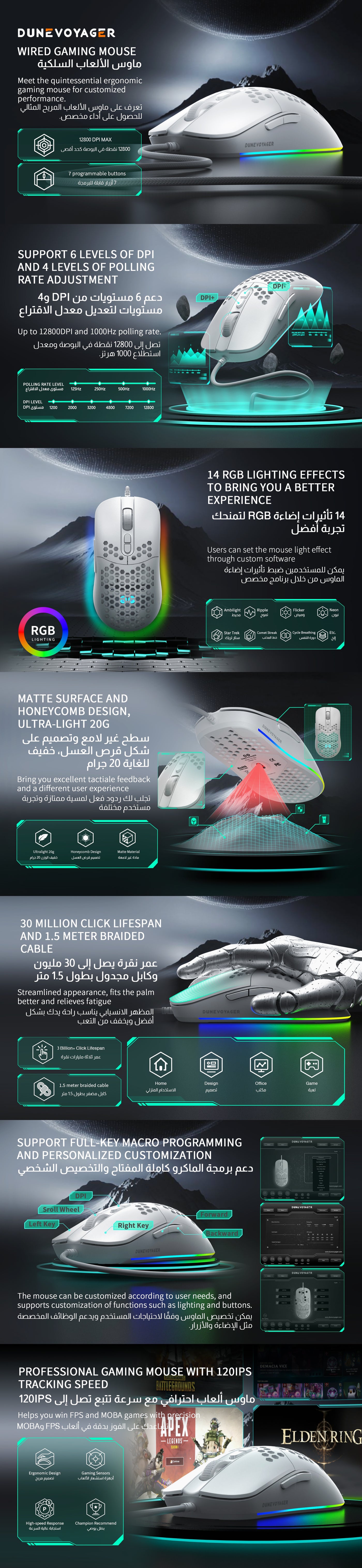The DV-GE4 gaming mouse by DuneVoyager features an ultra-lightweight design with a honeycomb structure that maximizes flexibility and reduces hand fatigue during extended gaming sessions. With a highly adjustable DPI range of 1-12800, it meets the precision and speed needs of various gaming styles. The mouse is equipped with 16.8 million customizable RGB lighting colors and 7 programmable buttons. Paired with computer software, players can tailor their gaming experience to personal preferences. The 1.5-meter braided cable is durable and flexible, and the mouse is designed for long-lasting use with a 30 million click lifespan.
