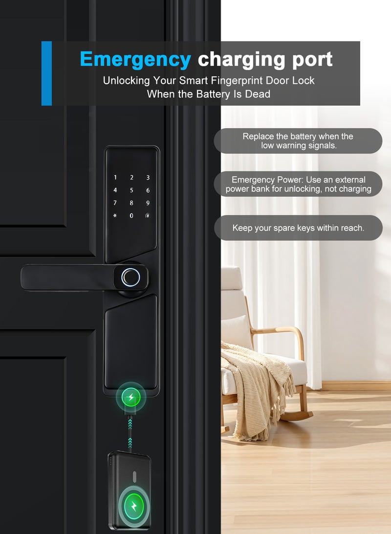 Battery and Durability: Powered by 4 AA batteries,our smart door lock operates for at least 6 months. It features a low battery sound alert to notify you when power is running low.