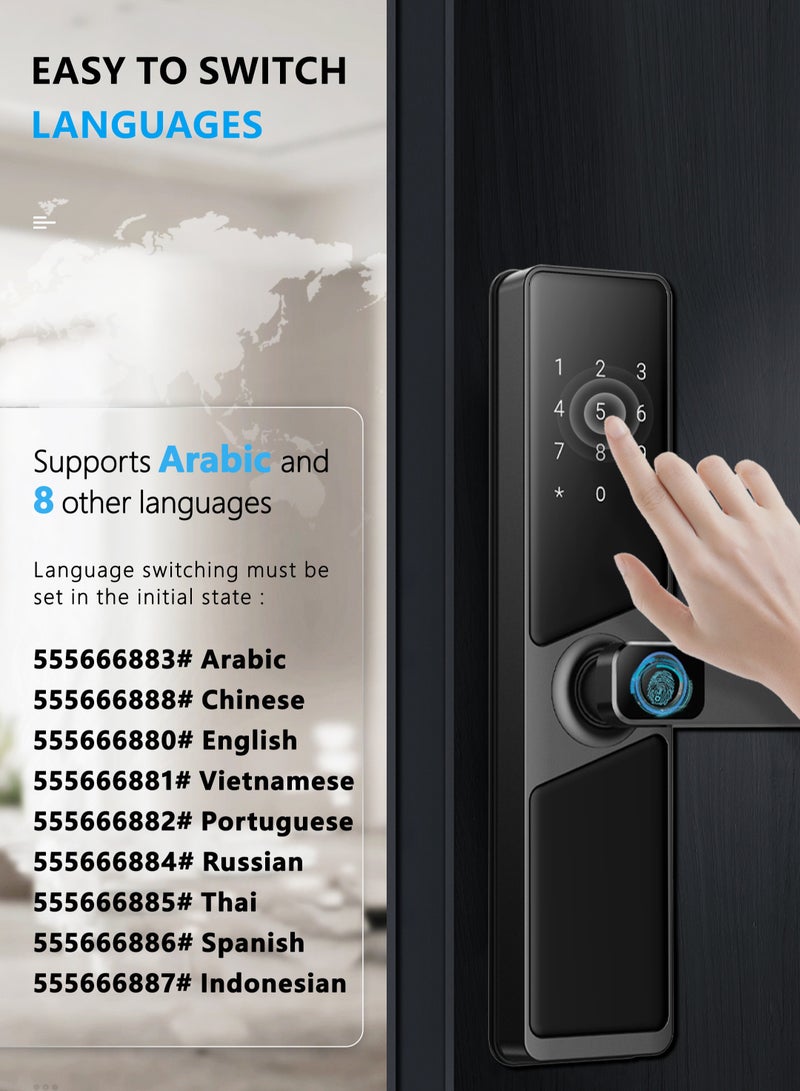 Supports Arabic and 8 other languages. Language switching must be set in the initial state : 555666883# Arabic 555666888# Chinese 555666880# English 555666881# Vietnamese 555666882# Portuguese 555666884# Russian 555666885# Thai 555666886# Spanish 555666887# Indonesian