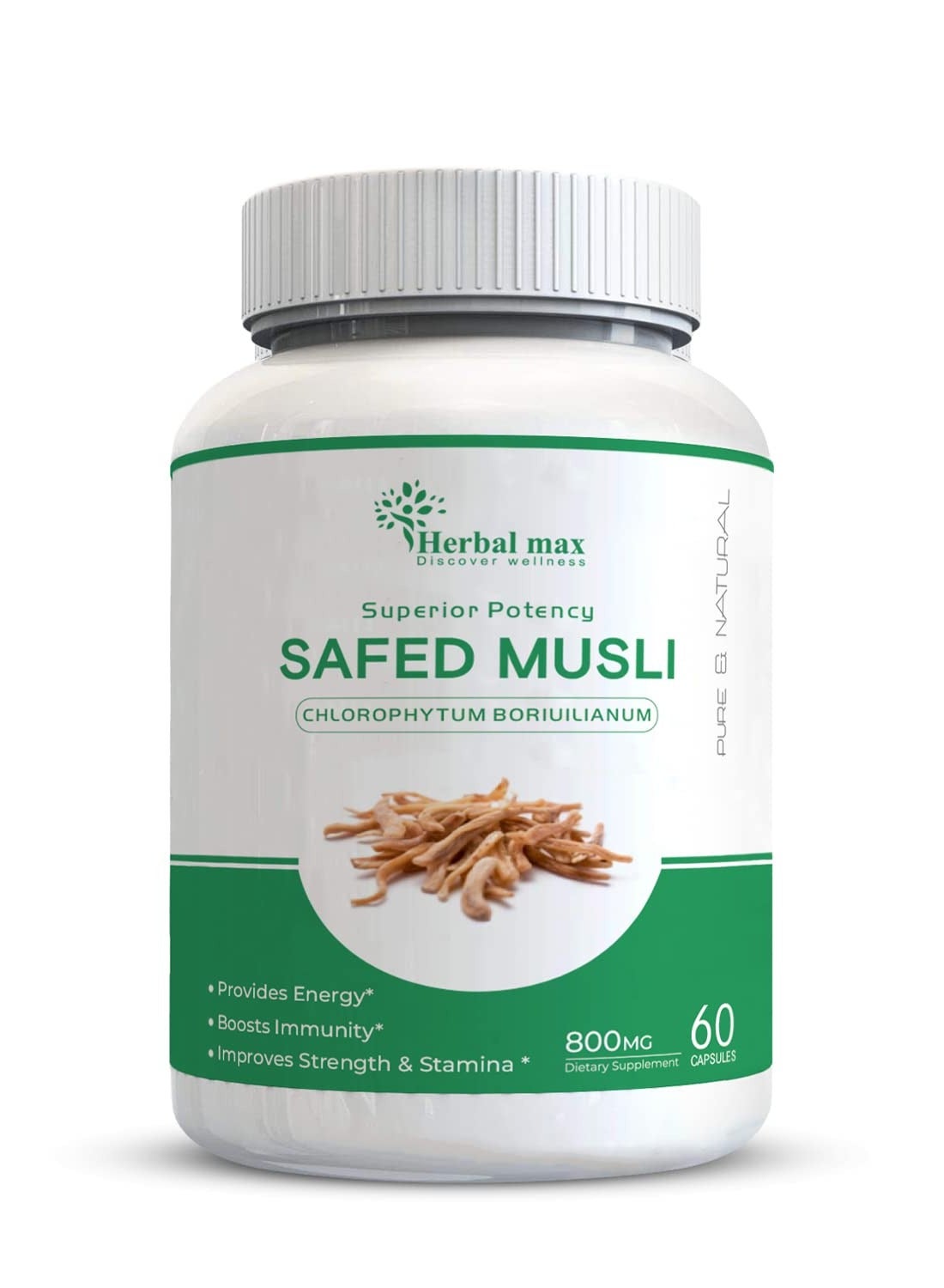 Herbal Max Safed Musli is formulated with high-quality, all-natural ingredients and produced according to strict purity and safety standards. Each capsule delivers a well-balanced dose to support overall wellness and daily vitality. For best results, take one capsule twice daily or as advised by a healthcare professional. This supplement is designed to naturally promote energy levels, support endurance, and help reduce occasional fatigue. Safed Musli is known in traditional wellness practices for its adaptogenic properties, which may aid the body in managing stress. Manufactured in a GMP-certified facility, our capsules are vegan, gluten-free, and contain no artificial additives. Additional benefits may include support for digestion, improved nutrient absorption, and overall rejuvenation. At Herbal Max, we are committed to providing high-quality, plant-based supplements to support a balanced and healthy lifestyle.