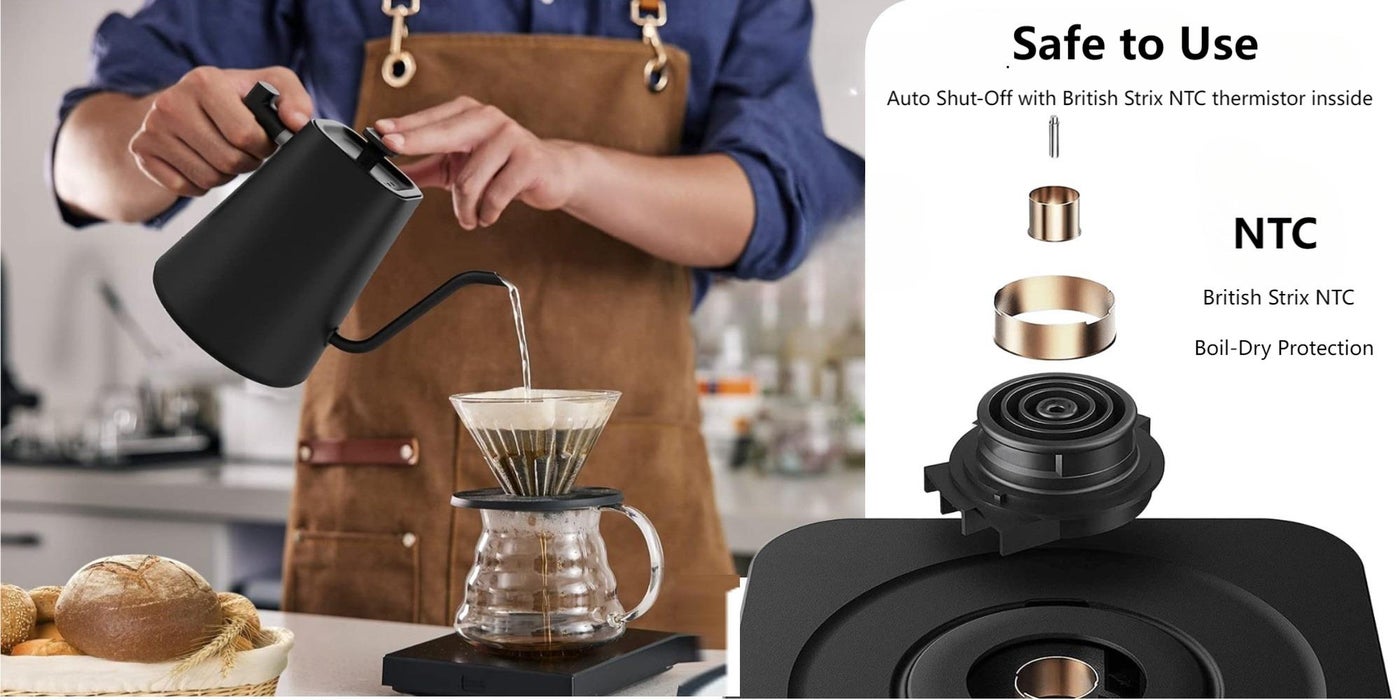 NTC anti-dry protection: If built-in NTC detects temp exceeds 105 °c, kettle will automatically power off and stop heating.