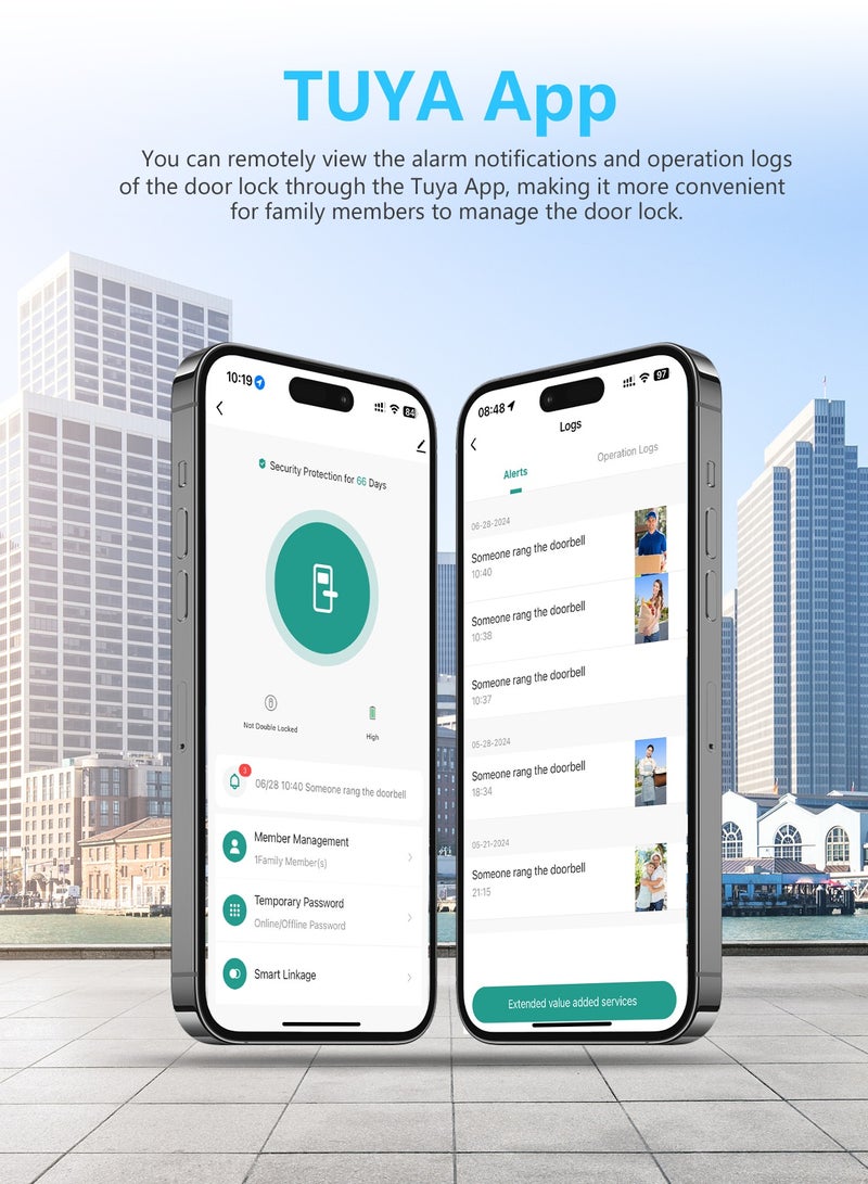 Keyless Entry: Unlock this door lock without a key using your password, fingerprint, or smart lock Tuya app. Say goodbye to fumbling for keys.our smart front door locks offer convenient access anytime.