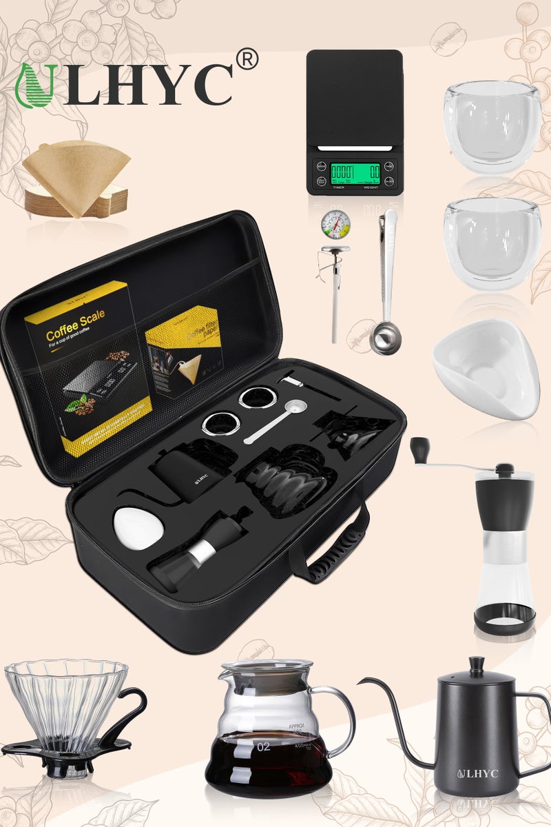 ULHYC bags are made of durable and high-quality materials, waterproof and shockproof. The gooseneck kettle is made of food-grade 304 stainless steel, high-precision professional coffee electronic scale, food-grade 304 stainless steel and ceramic grinding core grinder, 100 pieces of food-grade filter paper, no discoloration, no odor. The V60 coffee pot is made of heat-resistant borosilicate glass.