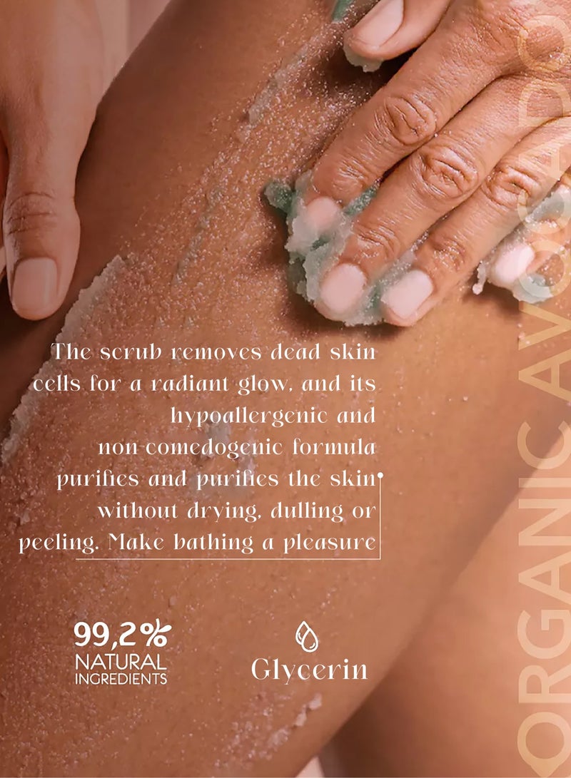 AVOCADO ICE CREAM TEXTURE-The texture of the body scrub is a silky ice cream texture that can be reached at your fingertips, and its hypoallergenic and non-comedogenic formula purifies and purifies the skin without drying, dulling or peeling.
