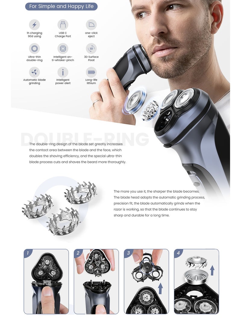 【1】3D FLOATING SHAVING HEAD: This men's electric razor adopts 54 self-sharpening blades and 0.11mm ultra-thin hypoallergenic stainless steel double cutter net, which greatly increases the contact area between the knife net and the face, and doubles the shaving efficiency and without any residue.The 3 sets 4D floating heads can form a Ergonomic V-Track shaving angle of 152 degree max when pressing over face, 360°fit skin contour.