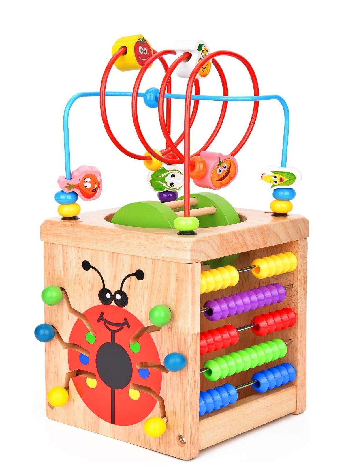 Bead Maze Toy: Includes 12.6x5.9x 5.9 inch wooden cube with curvy wire rides,learning clock,spin and match animals,turn and learn abc word tiles,abacus and bead roll maze.