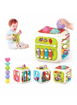 Wooden Activity Cube 6 in 1 Activity Center Toy Montessori Wood Toys Early Learning Educational Toy with Bead Maze Shape Sorter and Bells