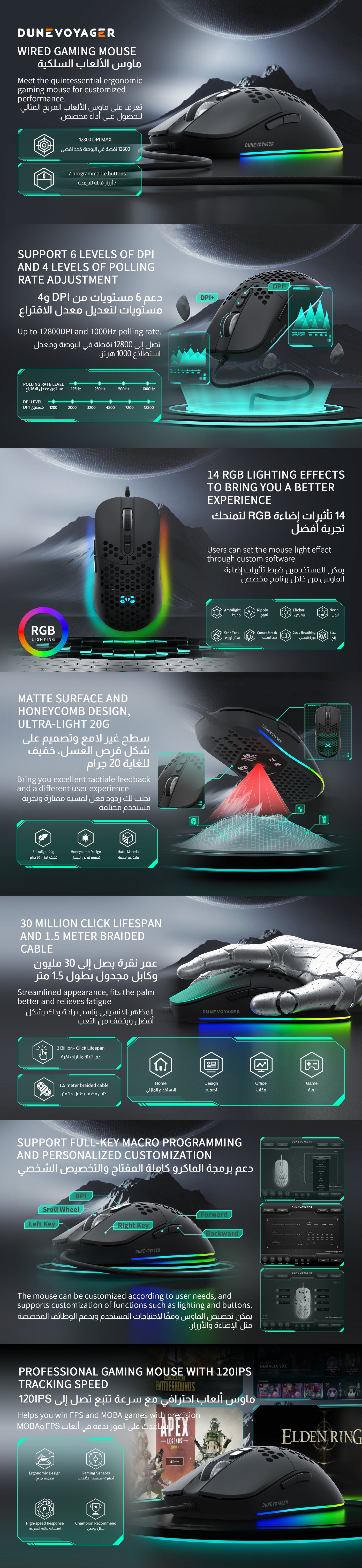 The DV-GE4 gaming mouse by DuneVoyager features an ultra-lightweight design with a honeycomb structure that maximizes flexibility and reduces hand fatigue during extended gaming sessions. With a highly adjustable DPI range of 1-12800, it meets the precision and speed needs of various gaming styles. The mouse is equipped with 16.8 million customizable RGB lighting colors and 7 programmable buttons. Paired with computer software, players can tailor their gaming experience to personal preferences. The 1.5-meter braided cable is durable and flexible, and the mouse is designed for long-lasting use with a 30 million click lifespan.