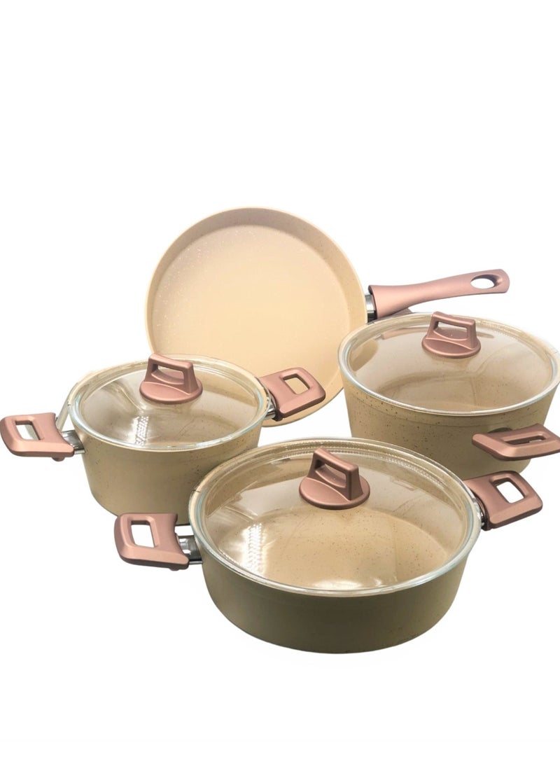 | Set Includes | 7 Piece Pot Set with Glass Lids in the following sizes: 20 CM Saucepan with Glass Lid 24 CM Saucepan with Glass Lid Rice Pot 26 CM with Glass Lid Frying Pan 26 CM Made of The Highest Quality of Granite, Safe, Non-Sticky, Non-Reactive, sanitary, and High Reliability. The Size of The Carton Set Is 30X34X42 CM |