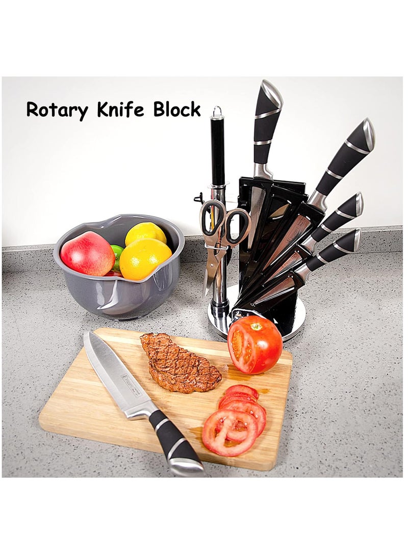 Rotary Knife Block: The bottom of the 360° rotating knife block has a non-slip design and the base is stable. Put the knives in the knife block after use, which is beautiful and does not take up space, so that your kitchen looks neat and tidy.