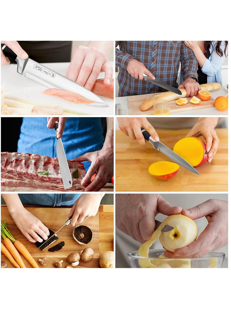High Quality: This set of knives is made of high-carbon German stainless steel, each is finely ground by artisans by hand for durability, the V-shaped cutting edge is very sharp, and has a hardness that resists stains and corrosion.