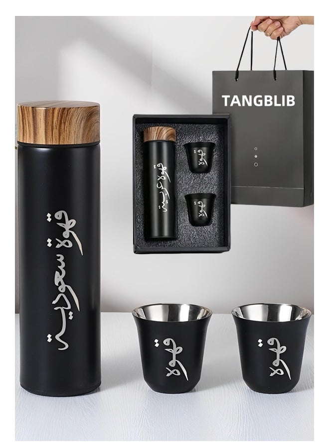 3pcs/set Coffee Insulated Cup Set With 2 Cups, Arabic Coffee Thermos, Insulated Cup Gift Box Set Includes 500ml Stainless Steel Thermos And 2 80ml Double-Layer Coffee Cups, Suitable For Gifts, Saudi National Day Gift.