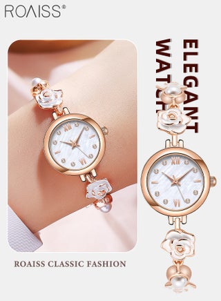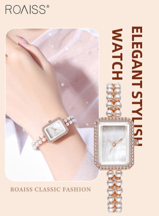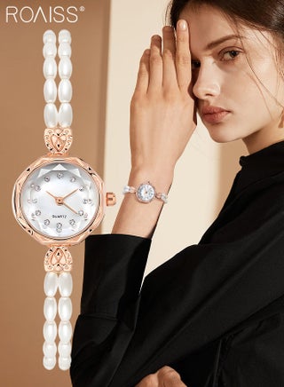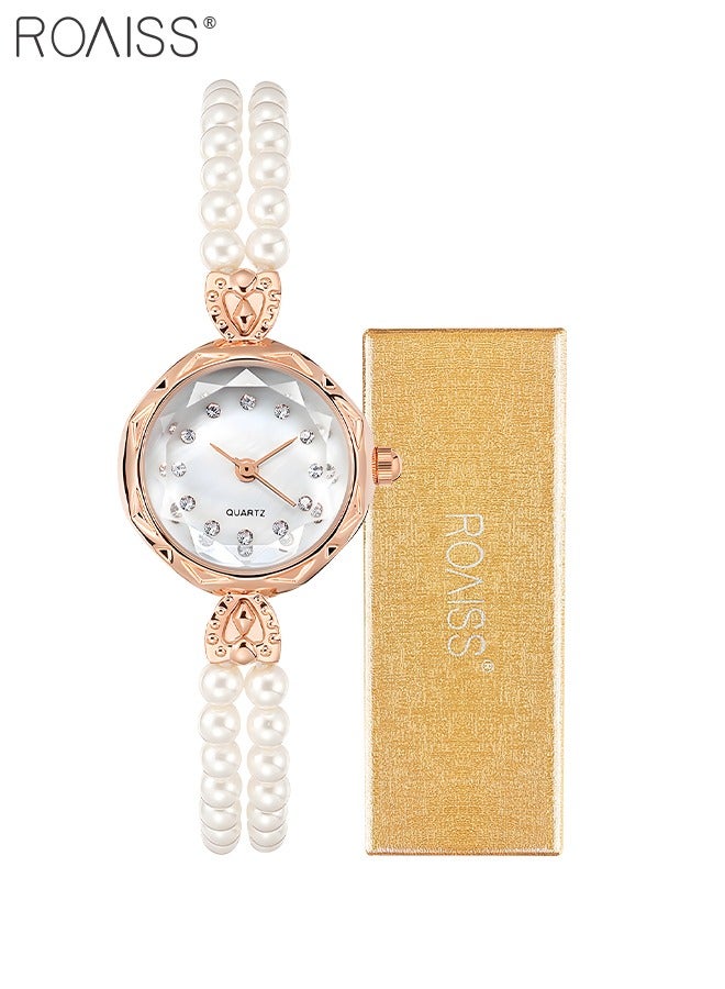 Women's Pearl Strap Quartz Watch Analog Display Round Dial with Rhinestones Decoration Waterproof Bracelet Wristwatch as Gift for Women