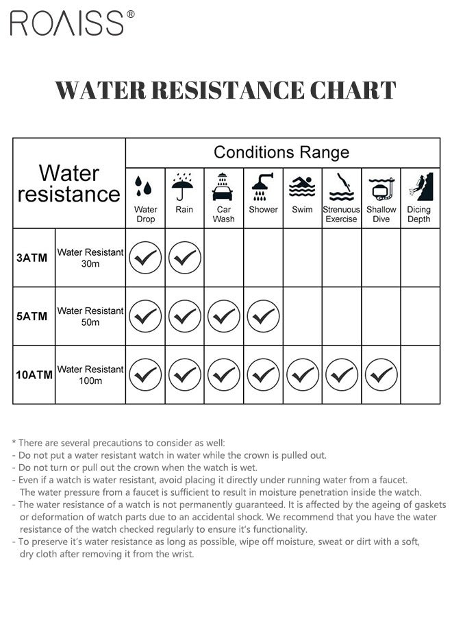 【3ATM Daily Waterproof】- Daily life waterproof, can bear sweat, accidental rain or water splash, but not suitable for bathing, swimming, diving and so on.