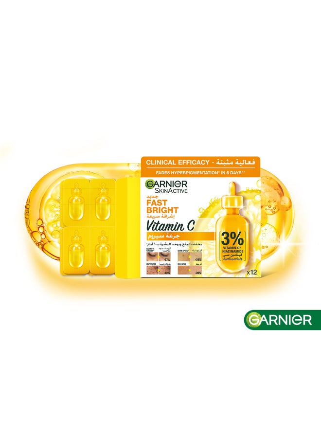 | What's In The Box | Garnier Skin Active Fast Bright Hyperpigmentation Ampoule Serum Multipack with 3% Vitamin C & Niacinamide, for dark circles (12 X 1.5ML) |