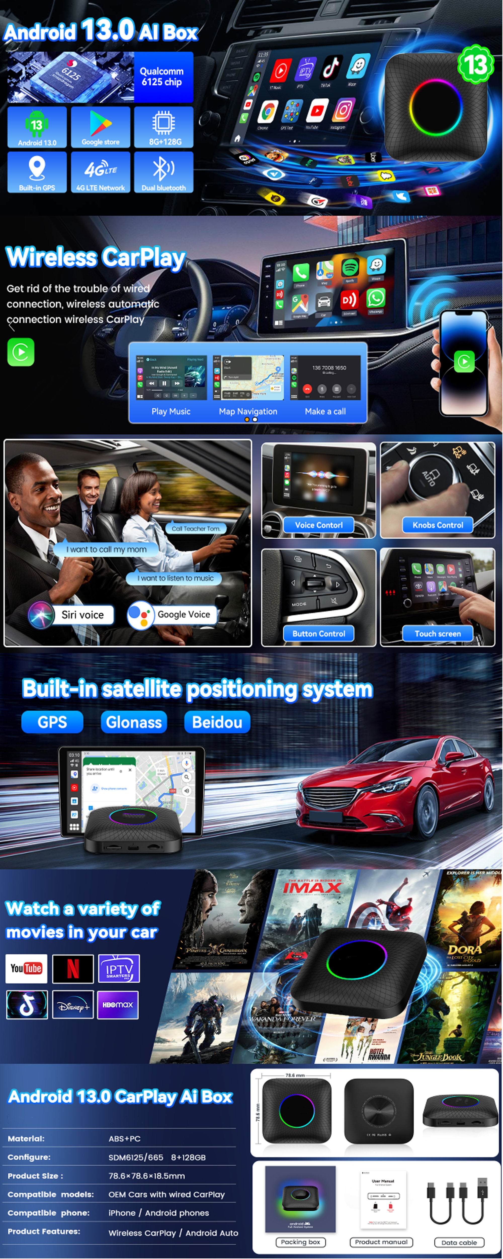 Wireless CarPlay Box - Wireless Android Auto 4GB+64GB (RAM+ROM) - Car Adapter - 3-in-1 Car AI Box - Built-in GPS, Android 13, Dual-band Wifi, Bluetooth