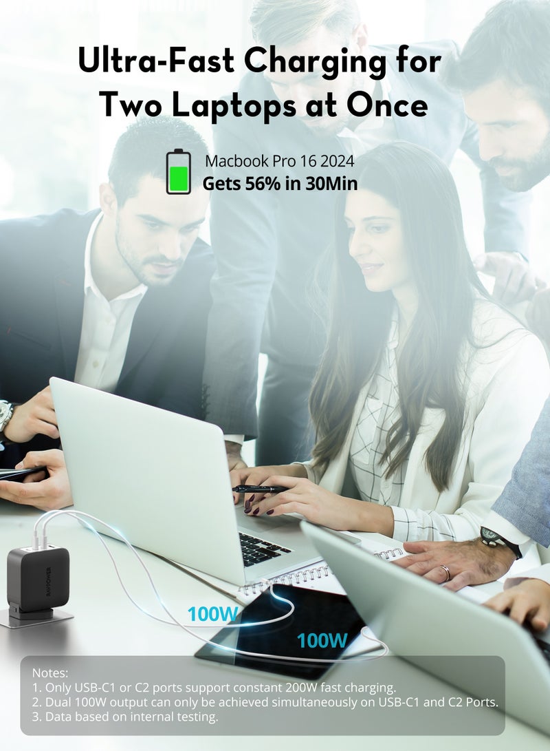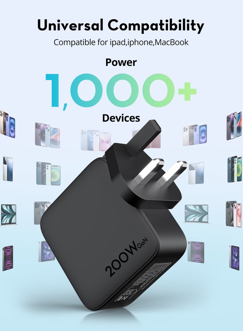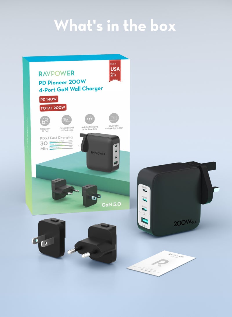 The RAVPower 200W Travel Charger is the perfect solution for travelers and multi-device users. With its compact design and support for the latest GaN 5.0 fast charging technology, this charger delivers a massive 200W of power to charge your devices efficiently and safely wherever you are in the world. Equipped with four charging ports (2 Type-C + 2 USB), it comes with interchangeable heads (EU, UK, US) to cover over 190 countries, making it the perfect companion for every trip.