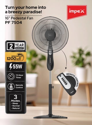 Experience powerful airflow and effortless cooling with the Impex Remote Pedestal Fan 16", a perfect blend of performance, convenience, and durability. Designed for modern homes and offices, this high-speed pedestal fan operates at 1200 RPM, delivering instant cooling even in the hottest conditions. Backed by a 2-year warranty, the fan features a 55W powerful motor that ensures efficient air circulation while being energy-efficient and low on noise.