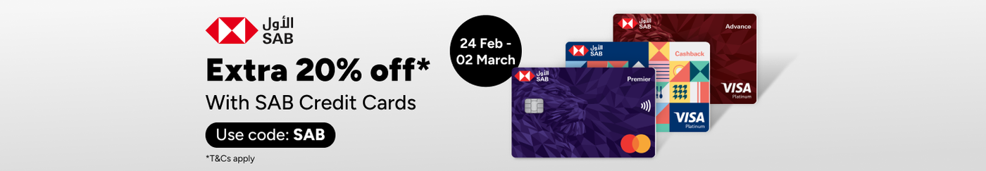 Discount will be applied when you checkout using your SAB Credit Card issued in KSA with the use of promo code SAB.