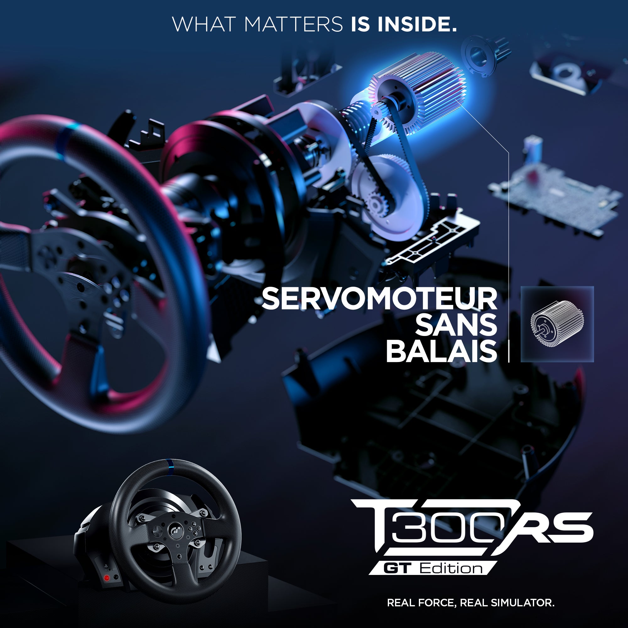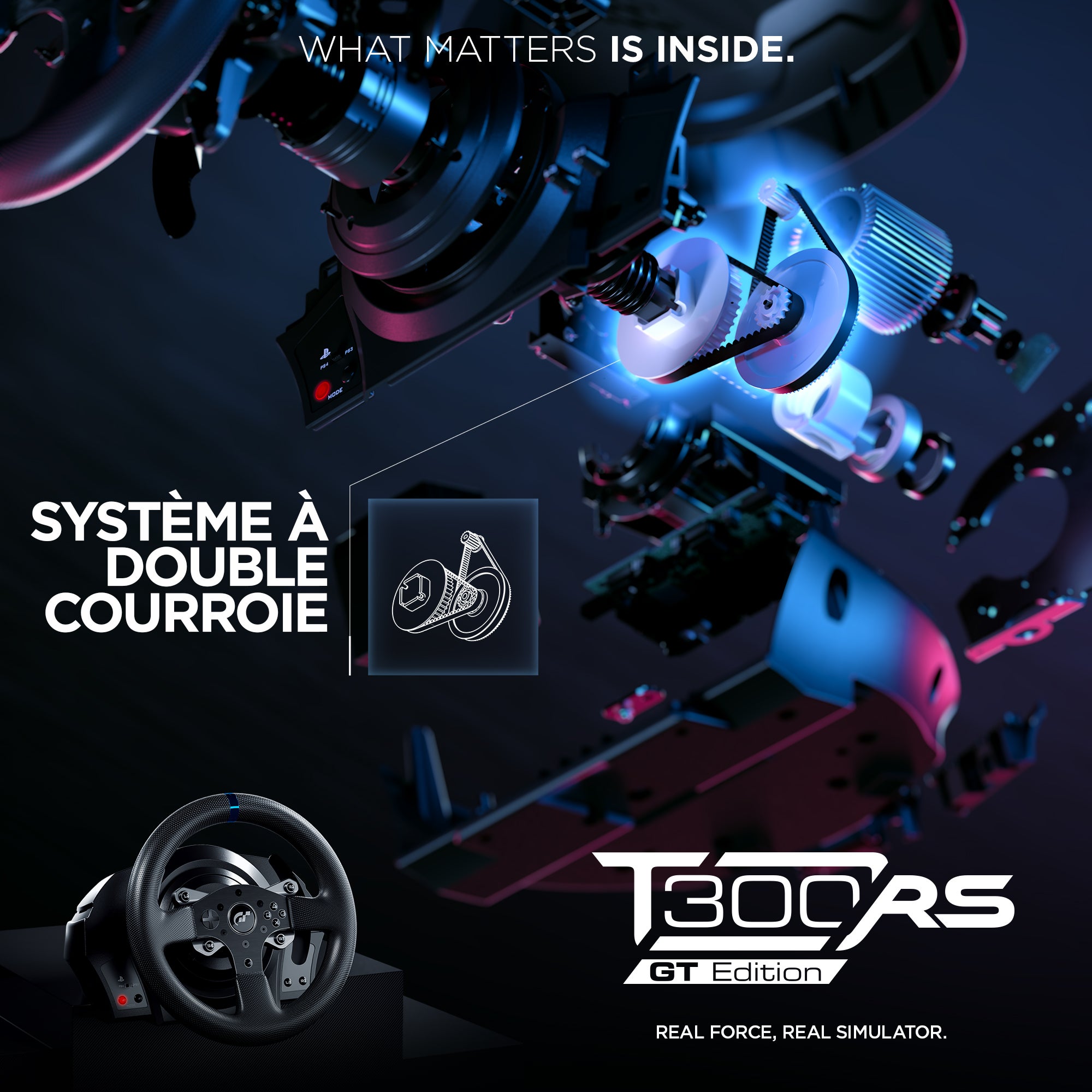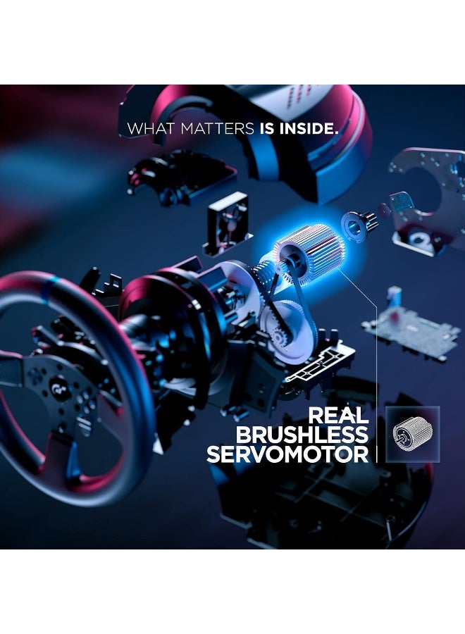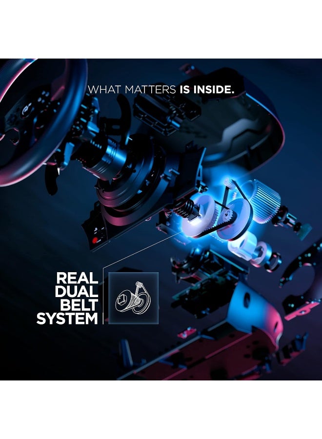 DUAL-BELT SYSTEM: The dual-belt mechanism allows for smoothing out of the different data elements received from the race course or circuit. Thanks to its direct link to the brushless motor, the system removes the possible presence of any dead zones and decreases uncomfortable jolting, without detracting from the power with which effects are transmitted to the user, for optimal realism in all racing environments.